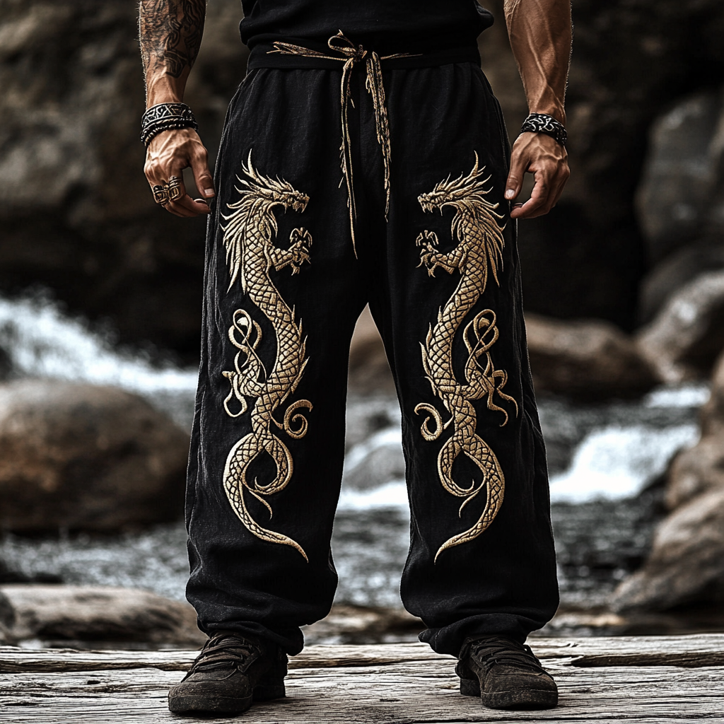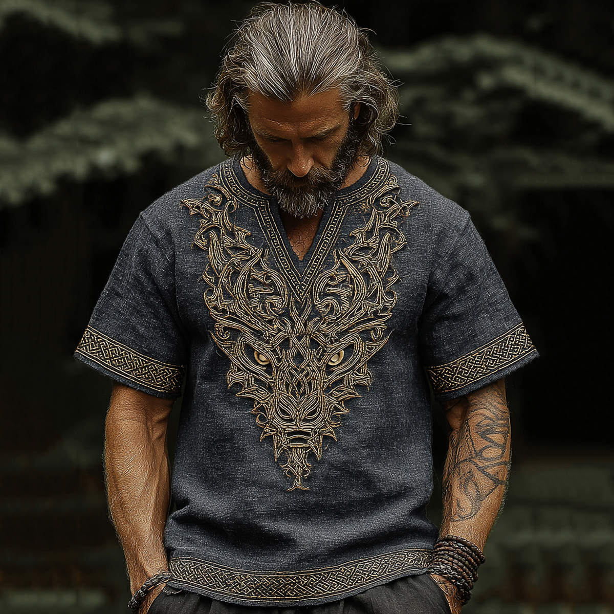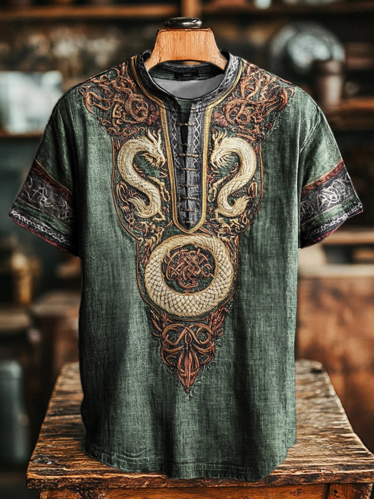 Men's Vintage Viking Dragon With Celtic Knot Pattern Cotton And Linen Long Sleeve Shirt