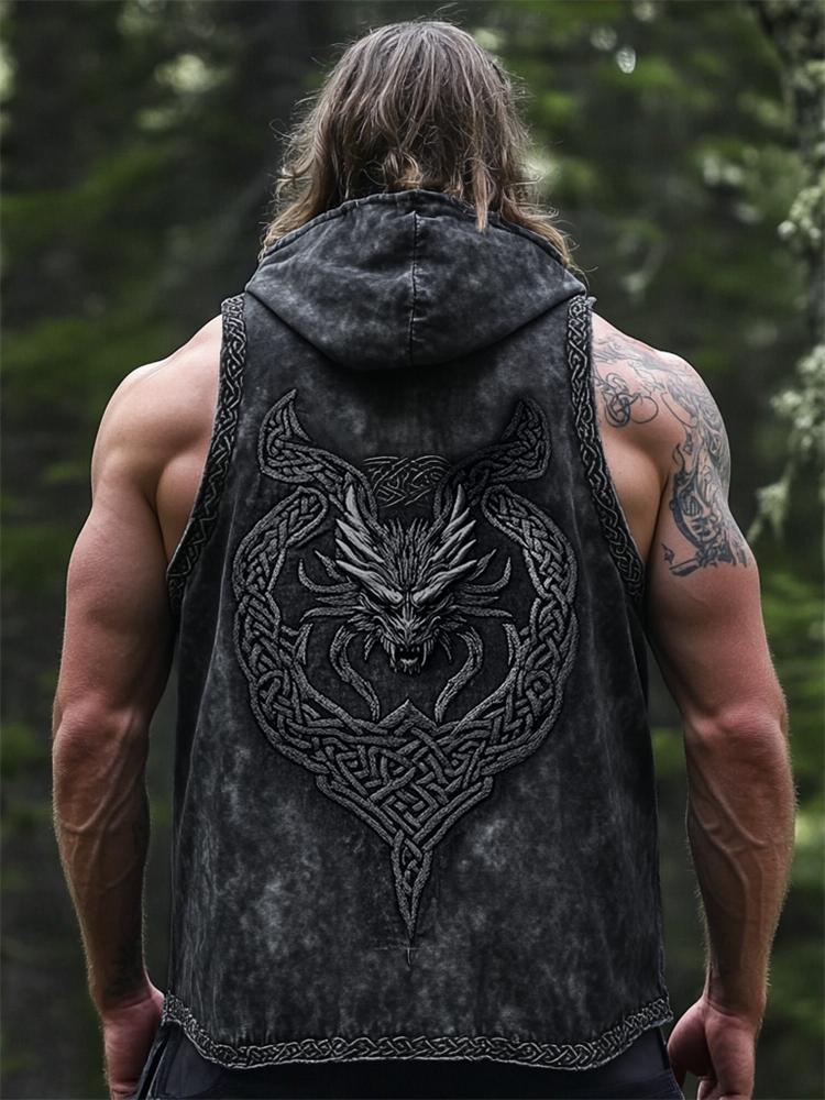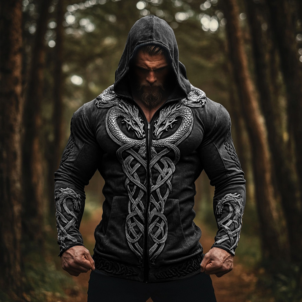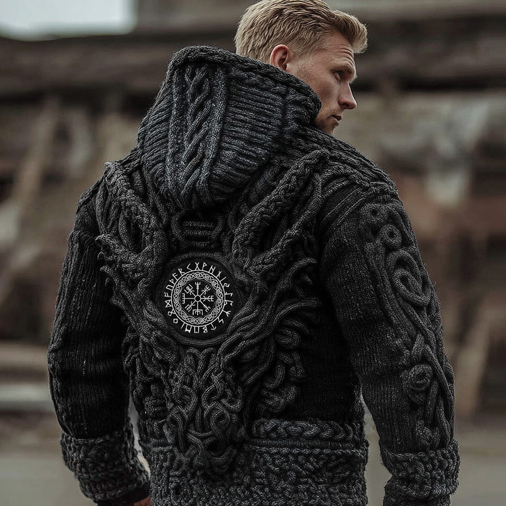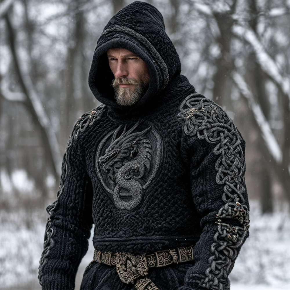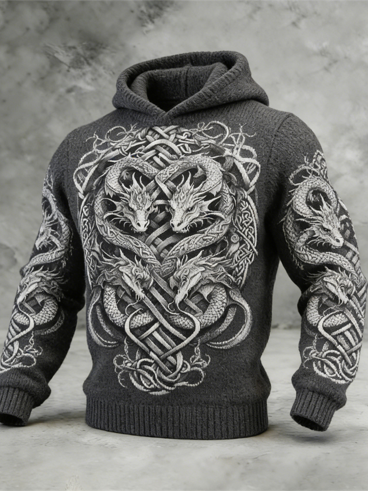 Men's Viking Tribal Dragon Celtic Knot Art Jacquard Chunky Knitted Cozy Hooded Sweater