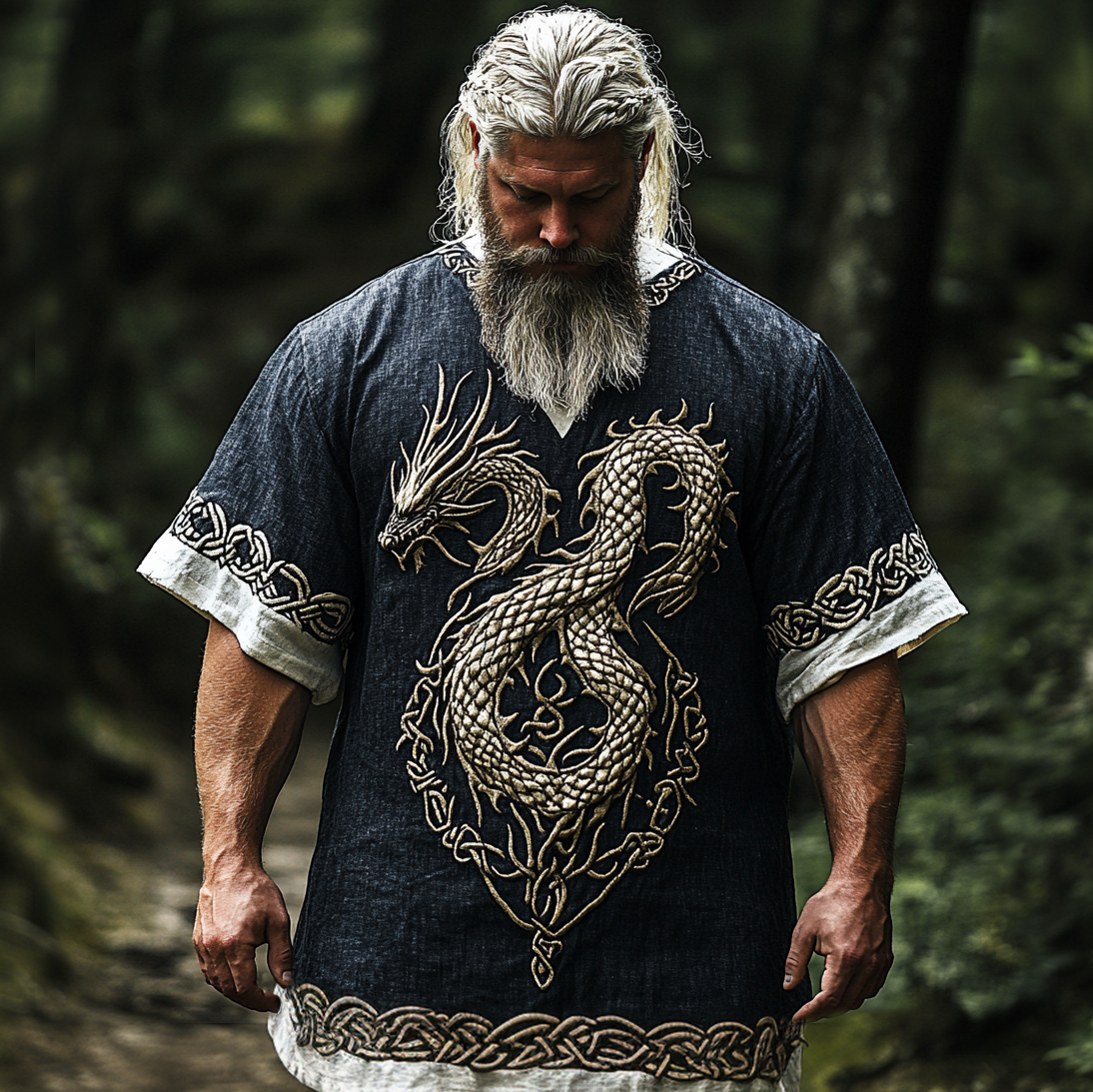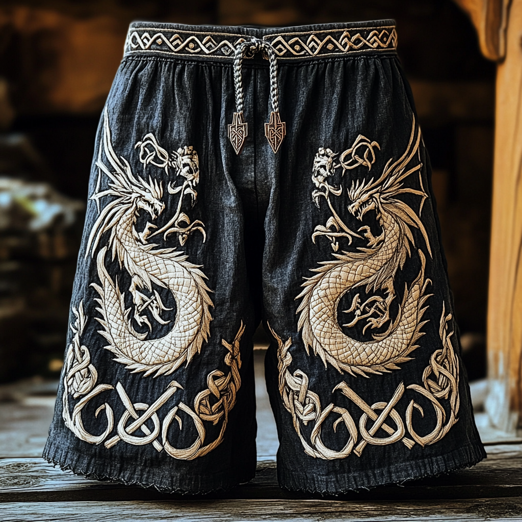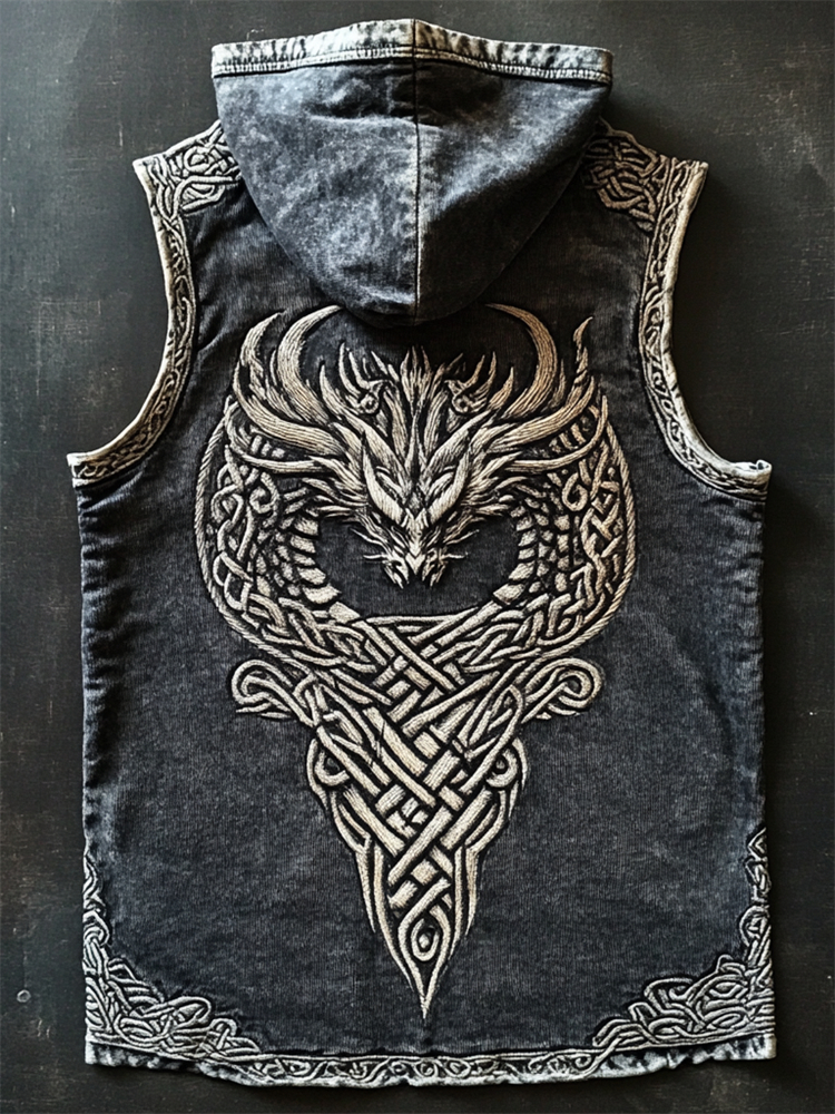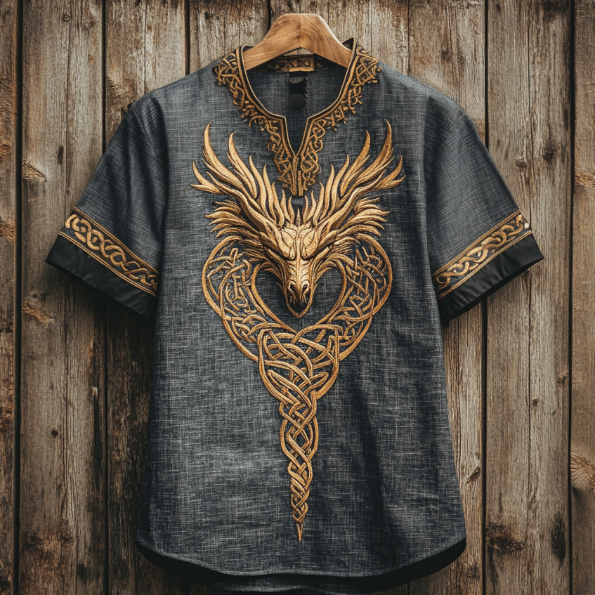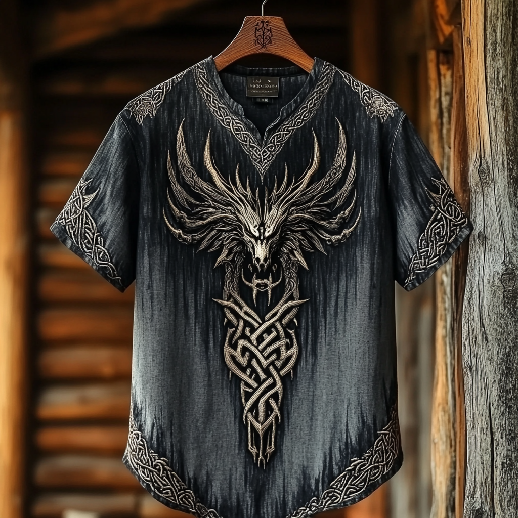 Men's Viking Tribal Dragon With Celtic Knotwork Embroidery Art Linen Round Neck T-shirt