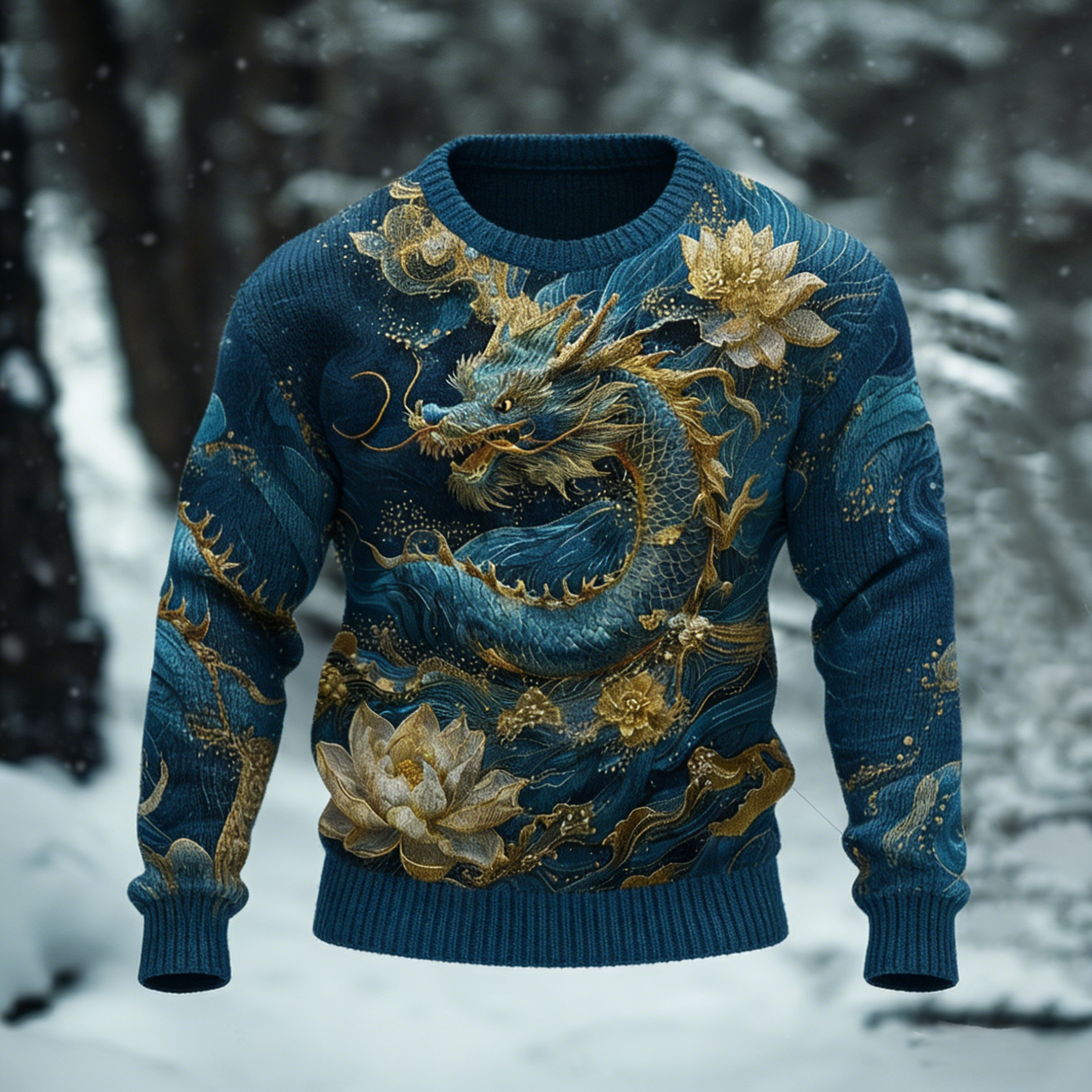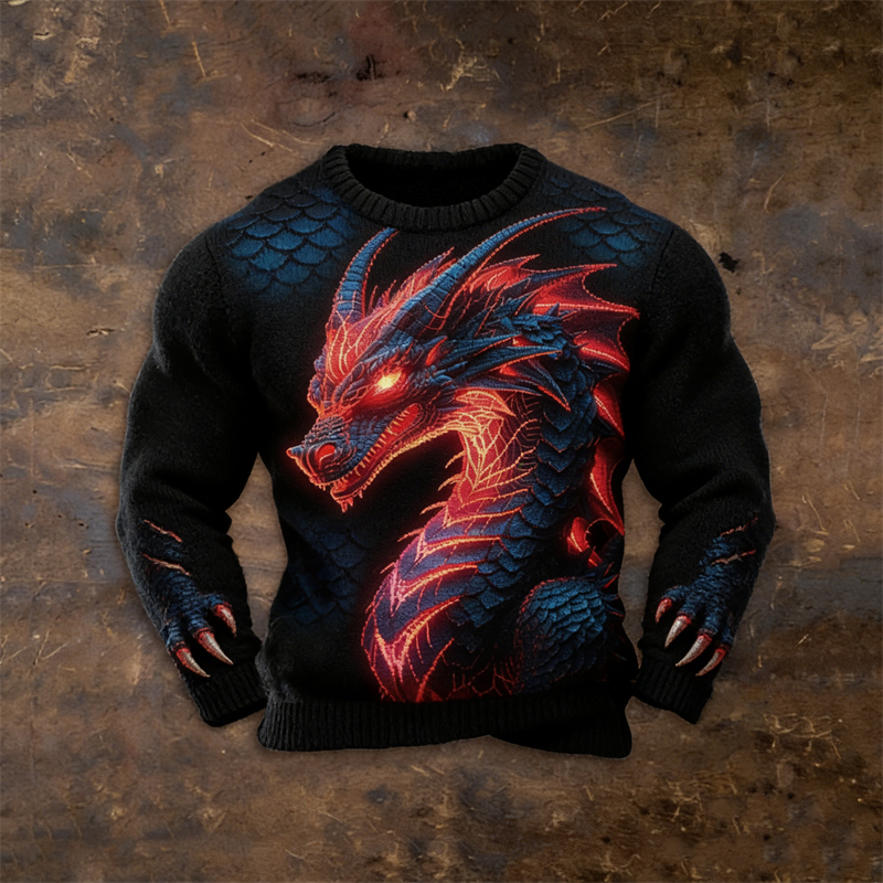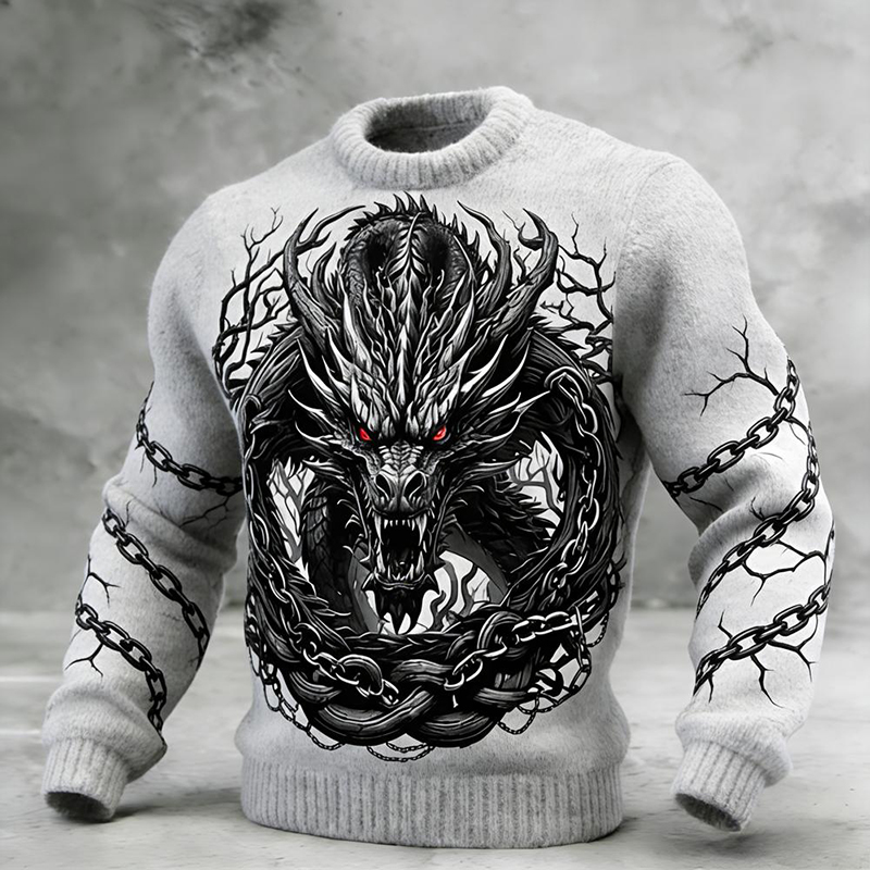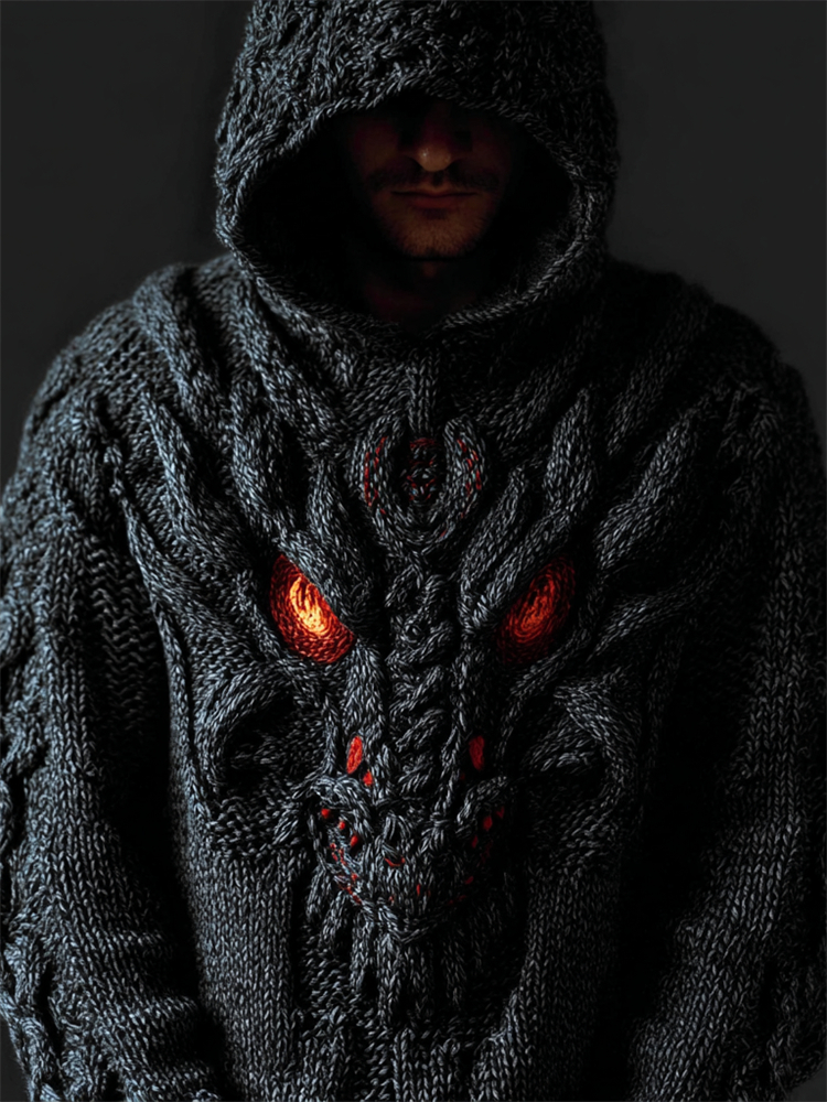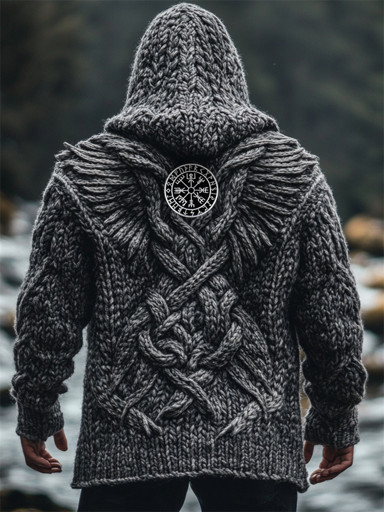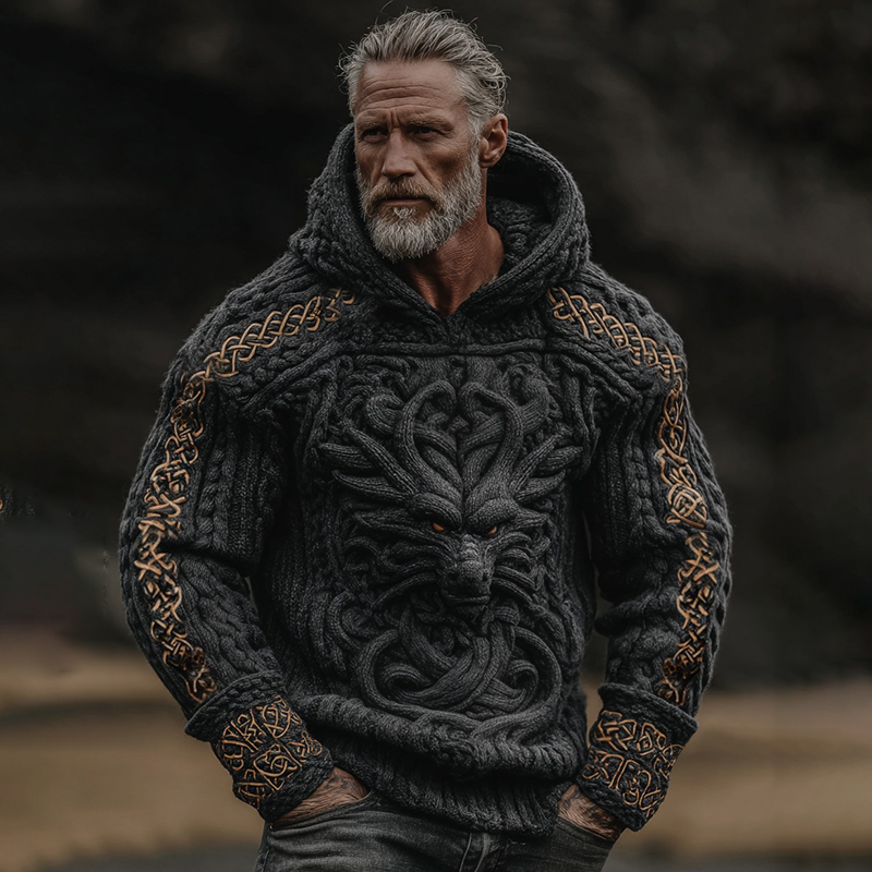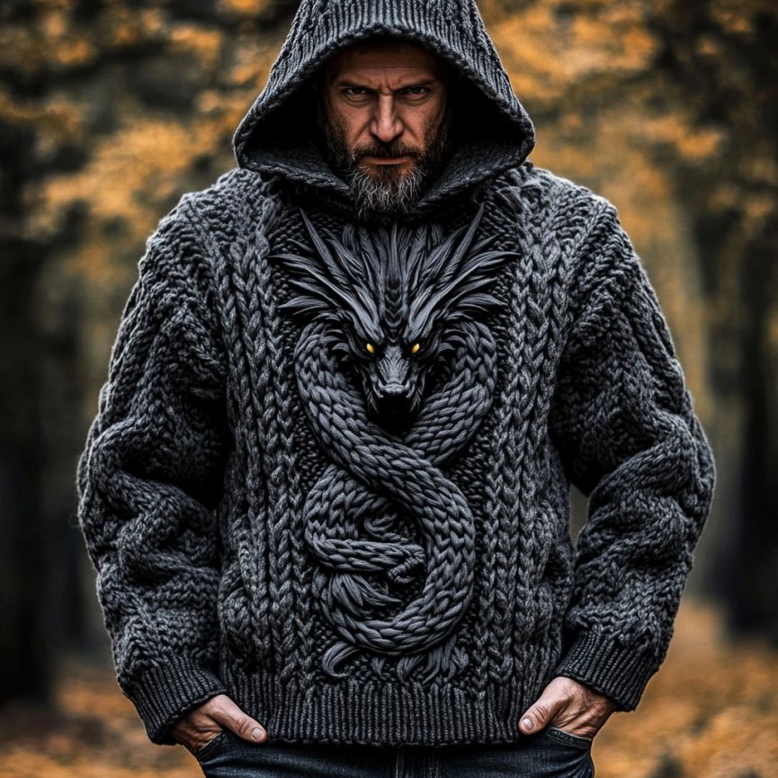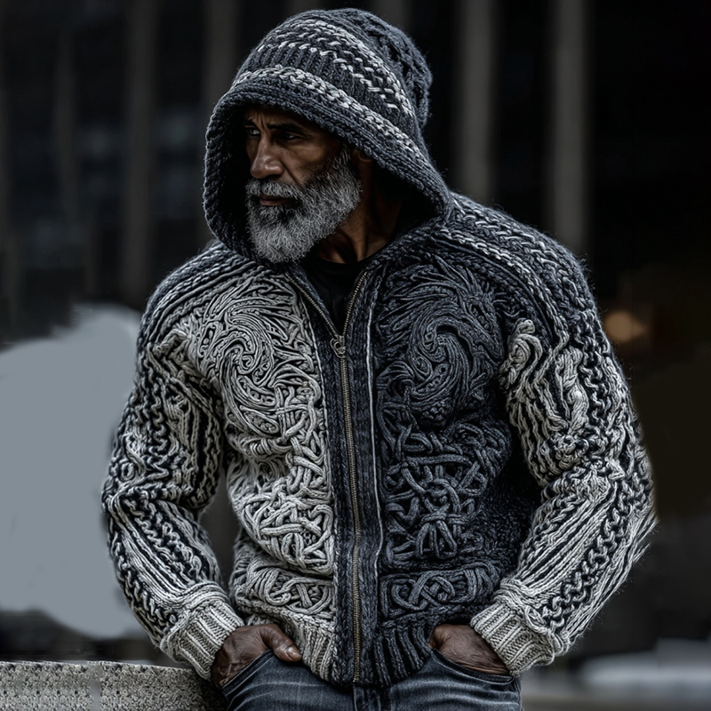 Men's Viking Tribal Dragon Celtic Knot Art Jacquard Chunky Knitted Cozy Hooded Sweater