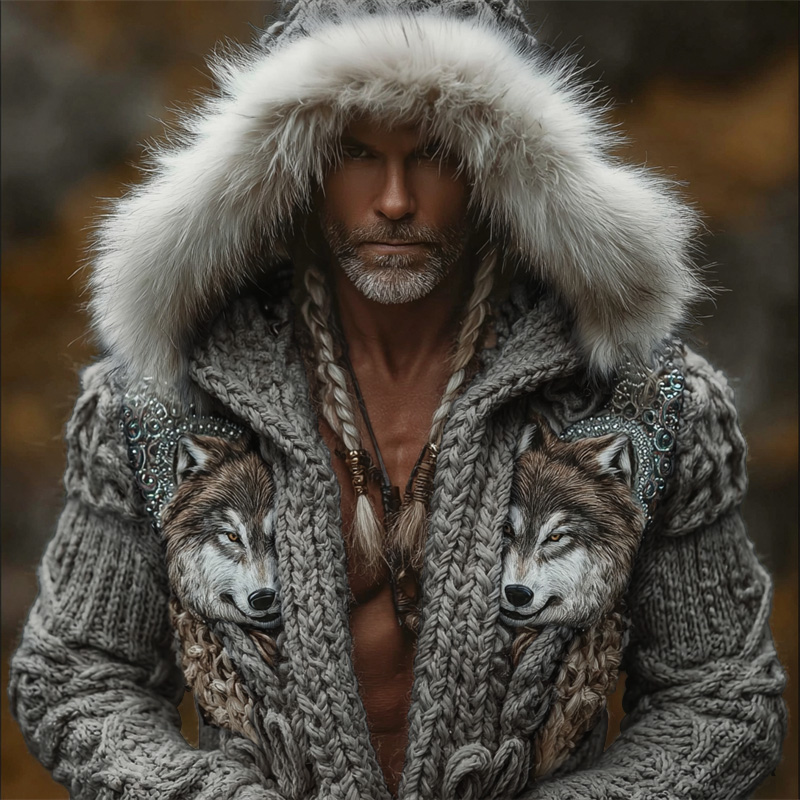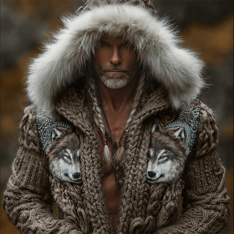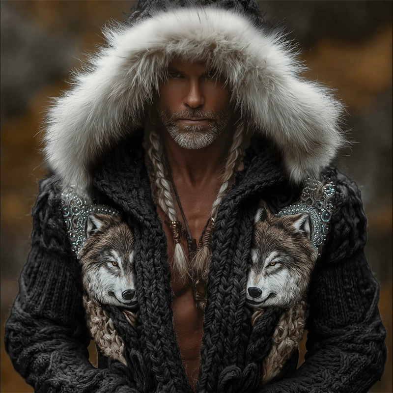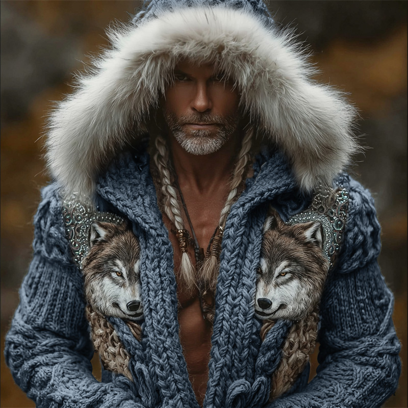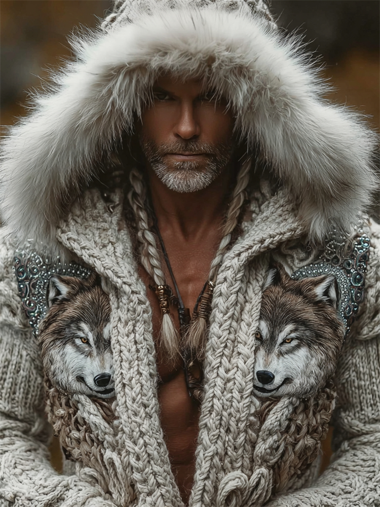 Men's Vintage Wolf Viking Fur Trim Hooded Chunky Cardigan