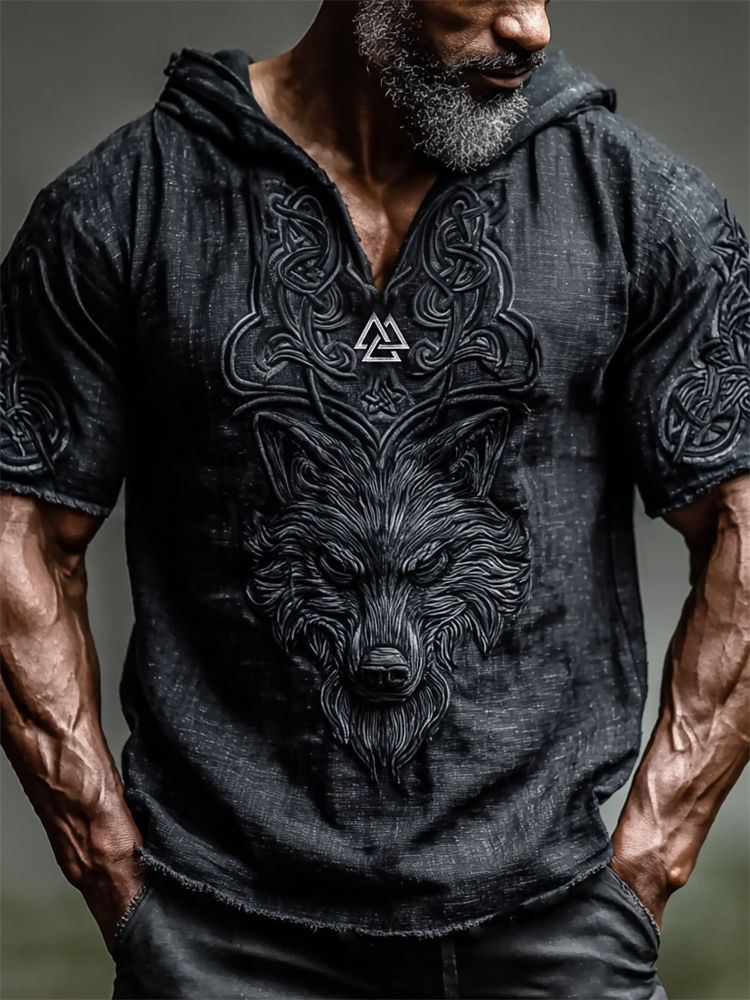 Men's Viking Celtic Wolf Embroidered Hooded Linen T Shirt