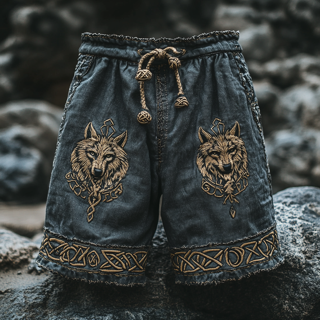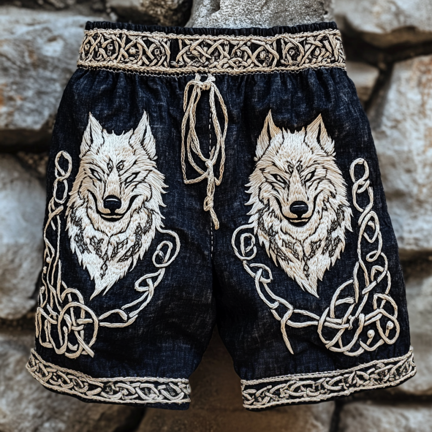 Men's Vintage Viking Wolf Celtic Knot Print Linen Blend Casual Shorts