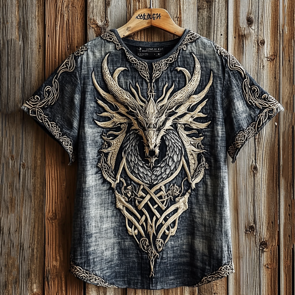 Men's Viking Celtic Wolf Head Washed Contrast Color Linen T-shirt