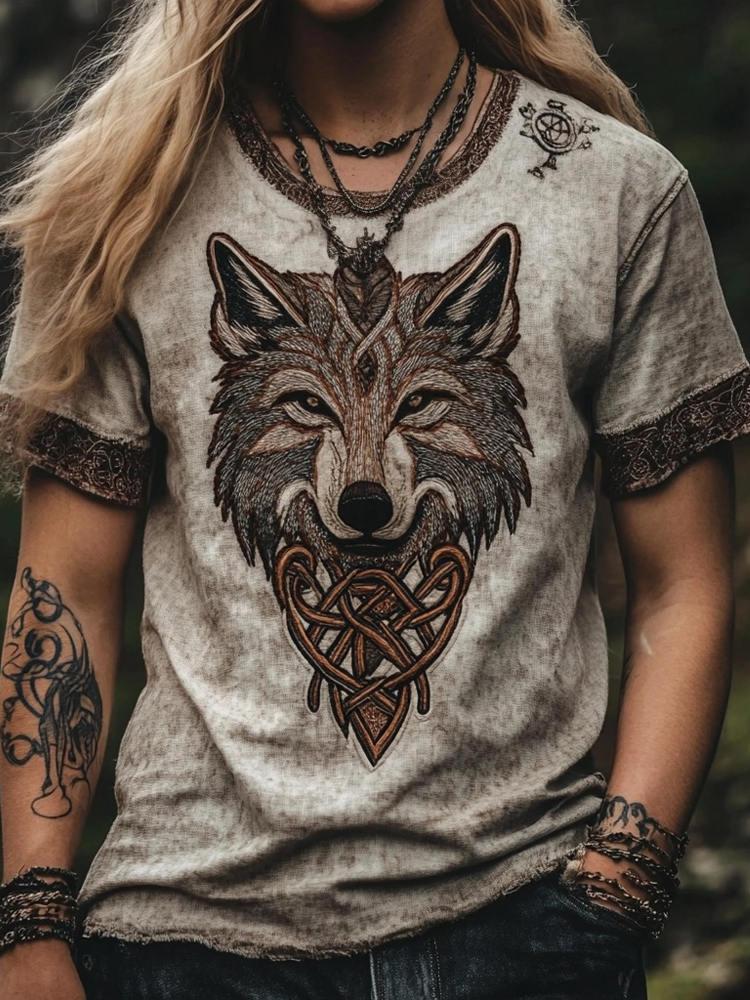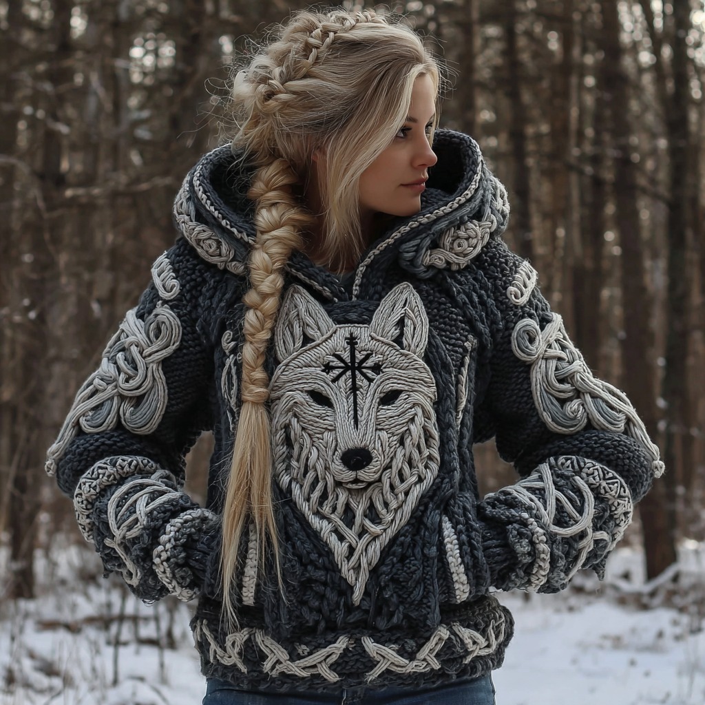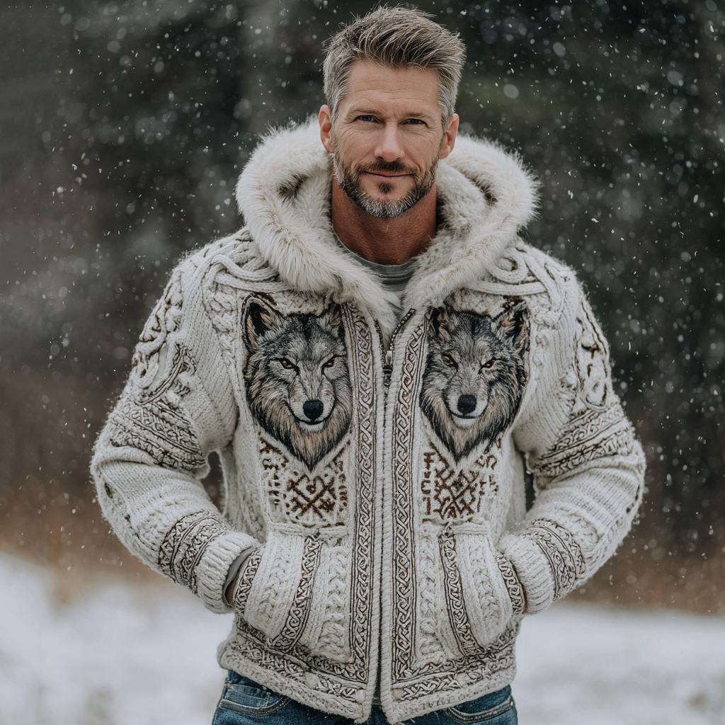 Men's Hooded Thick Sweater With Viking Style Tribal Totem And Wolf Totem Patterns