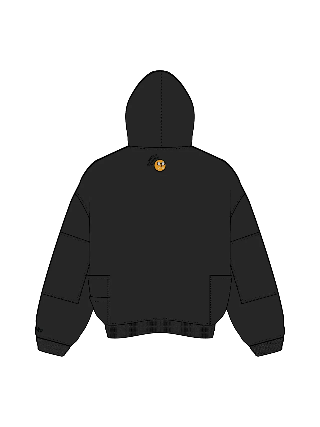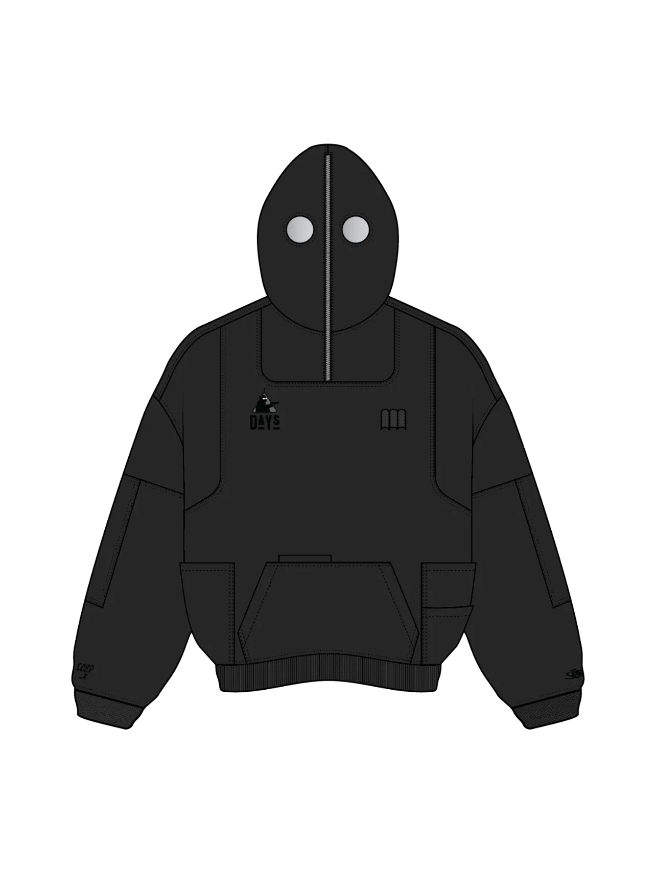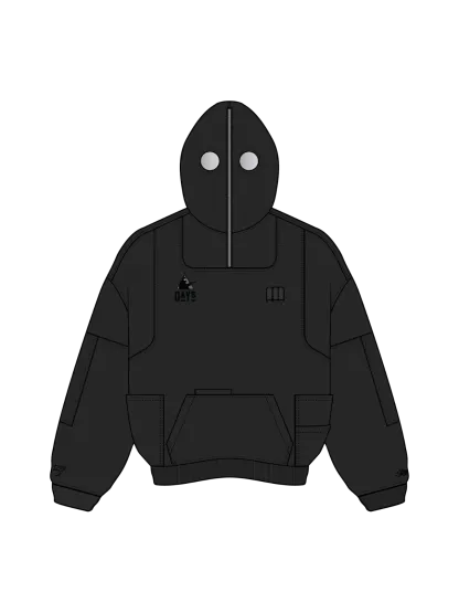 This is our classic hoodie made of double-layer thick acid washed French terry. Embroideries on both sides. The hoodie has 7 pockets and holders for three pens on the chest. The hood has a full zipline with see-through areas for the eyes