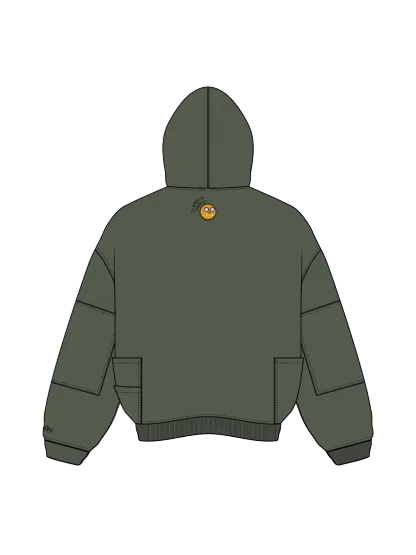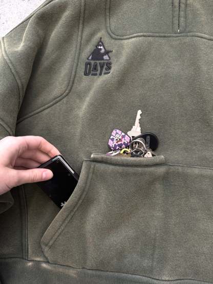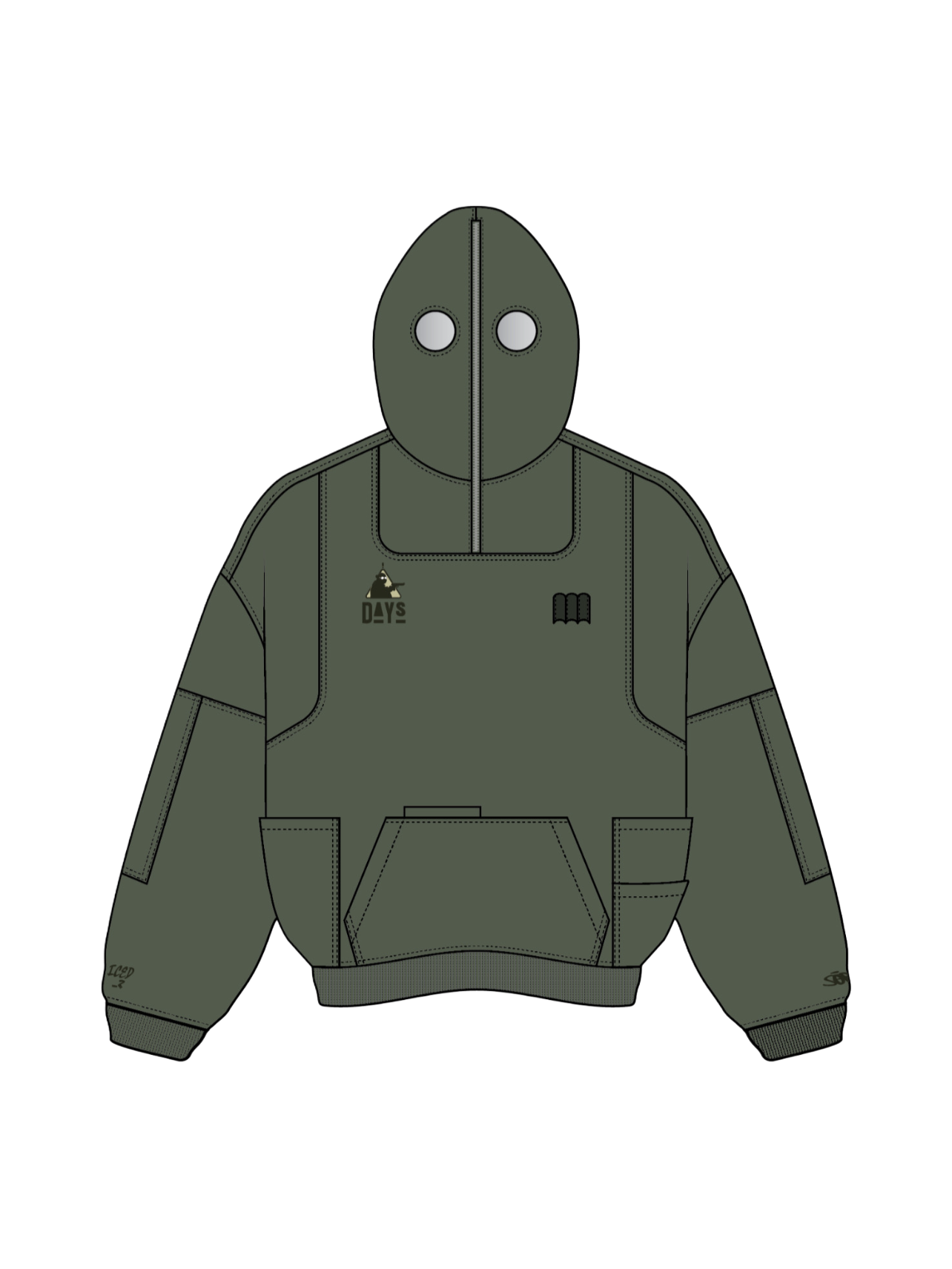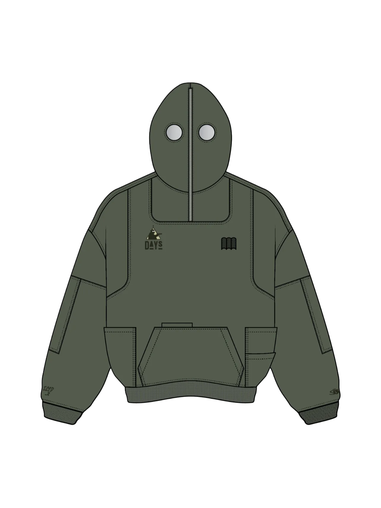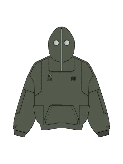 This is our classic hoodie made of double-layer thick acid washed French terry. Embroideries on both sides. The hoodie has 7 pockets and holders for three pens on the chest. The hood has a full zipline with see-through areas for the eyes