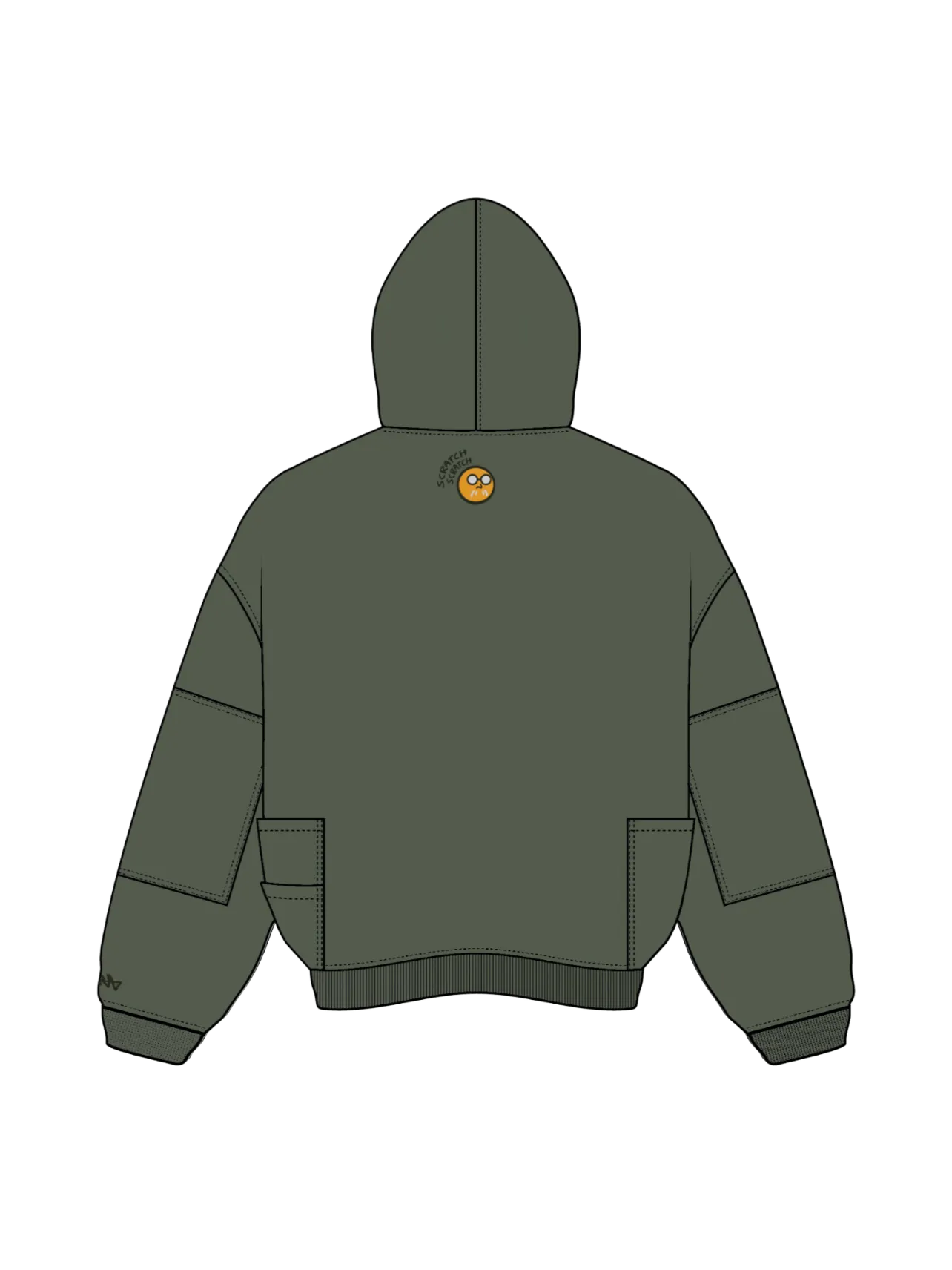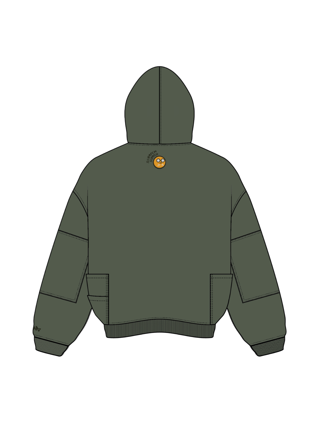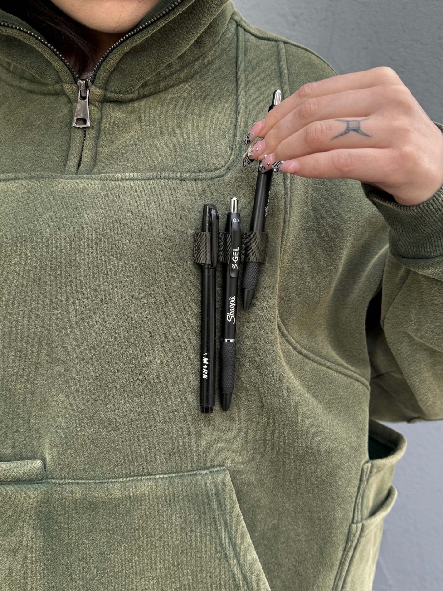 This is our classic hoodie made of double-layer thick acid washed French terry. Embroideries on both sides. The hoodie has 7 pockets and holders for three pens on the chest. The hood has a full zipline with see-through areas for the eyes