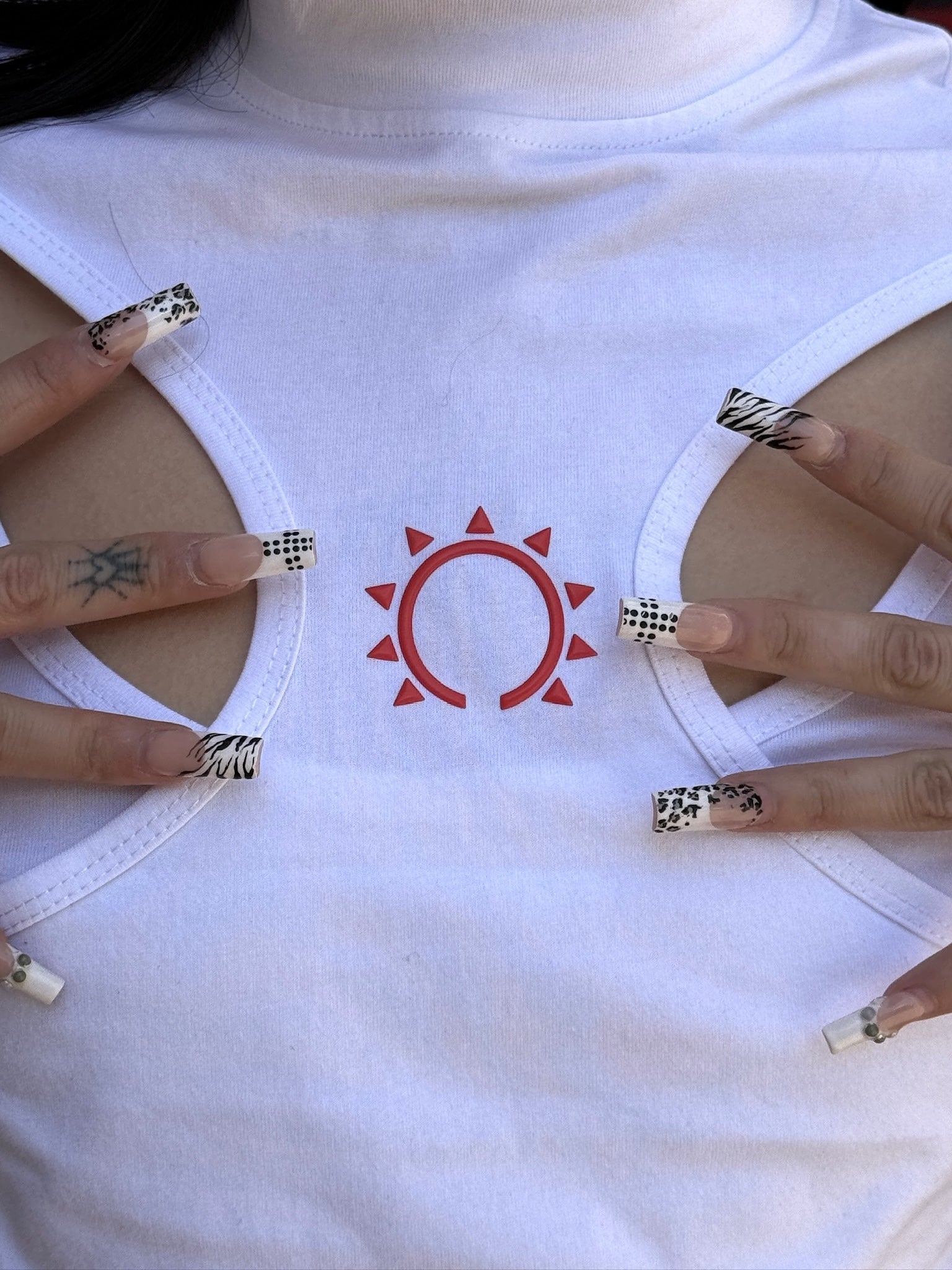 This long-sleeved top with cutouts on the chest and a raised silicone print design on the front is made of 100% High-Quality Soft Cotton. Soft, comfortable and breathable. Perfect for the summer weather this season.
