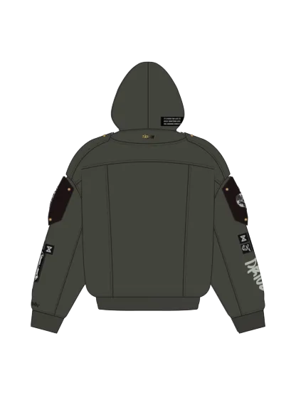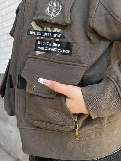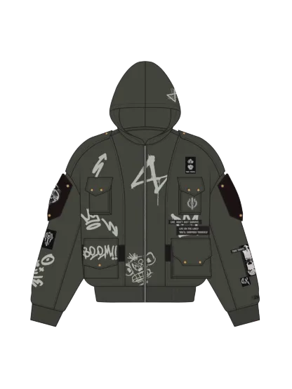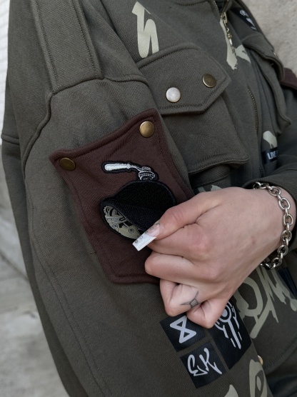 This is our classic zipup hoodie made of double-layer thick acid-washed French terry. Embroideries and prints on both sides. The hoodie has 7 pockets on the chest and sleeves. The hood has a full zipline. The left sleeve has a rubber patch embroidery
