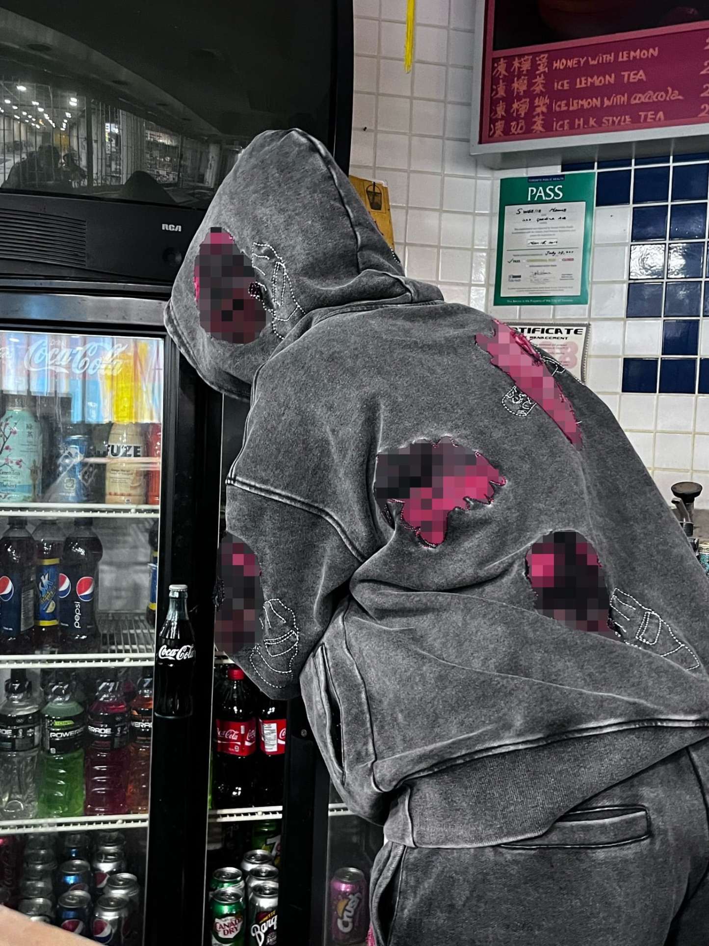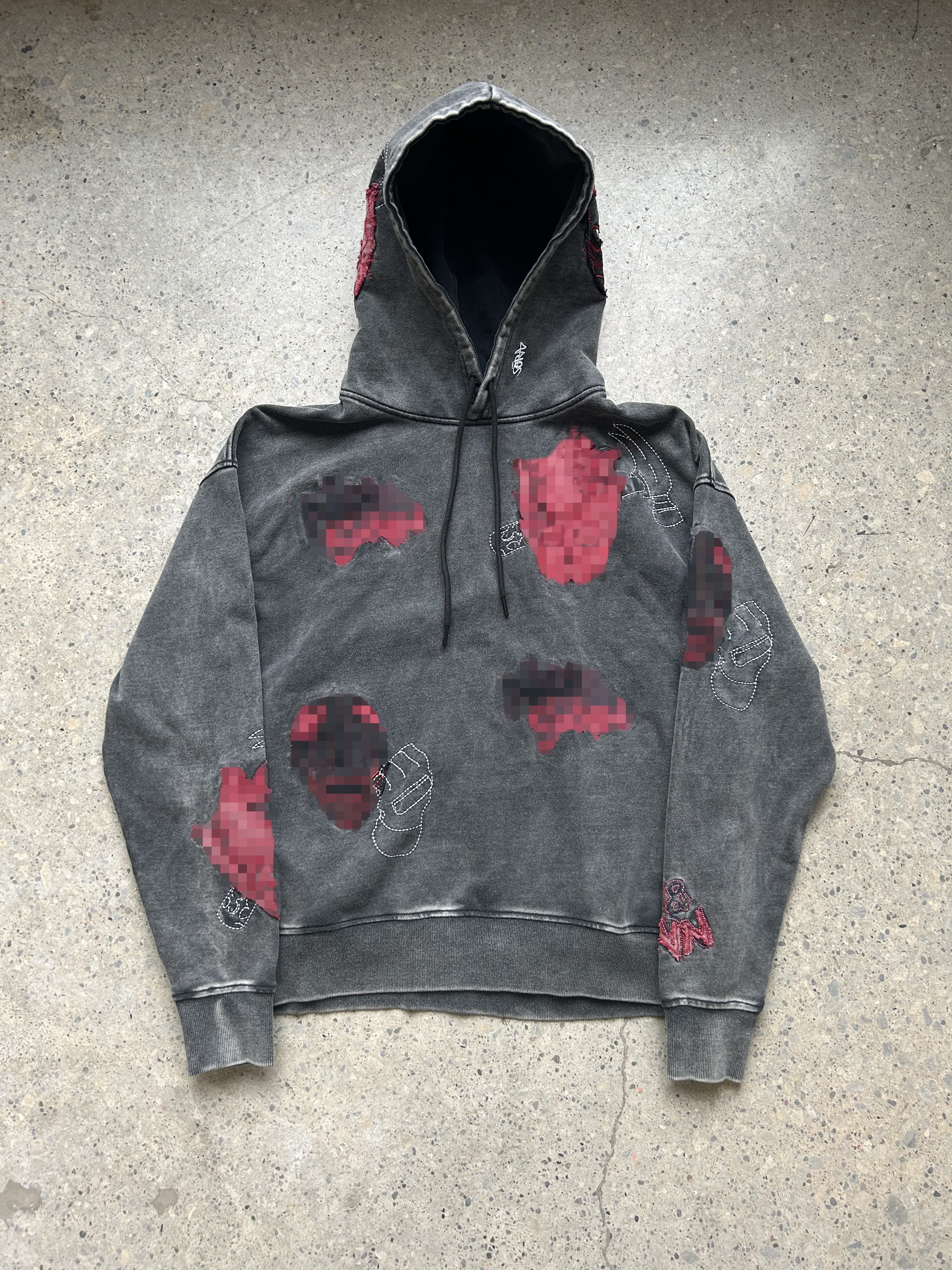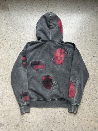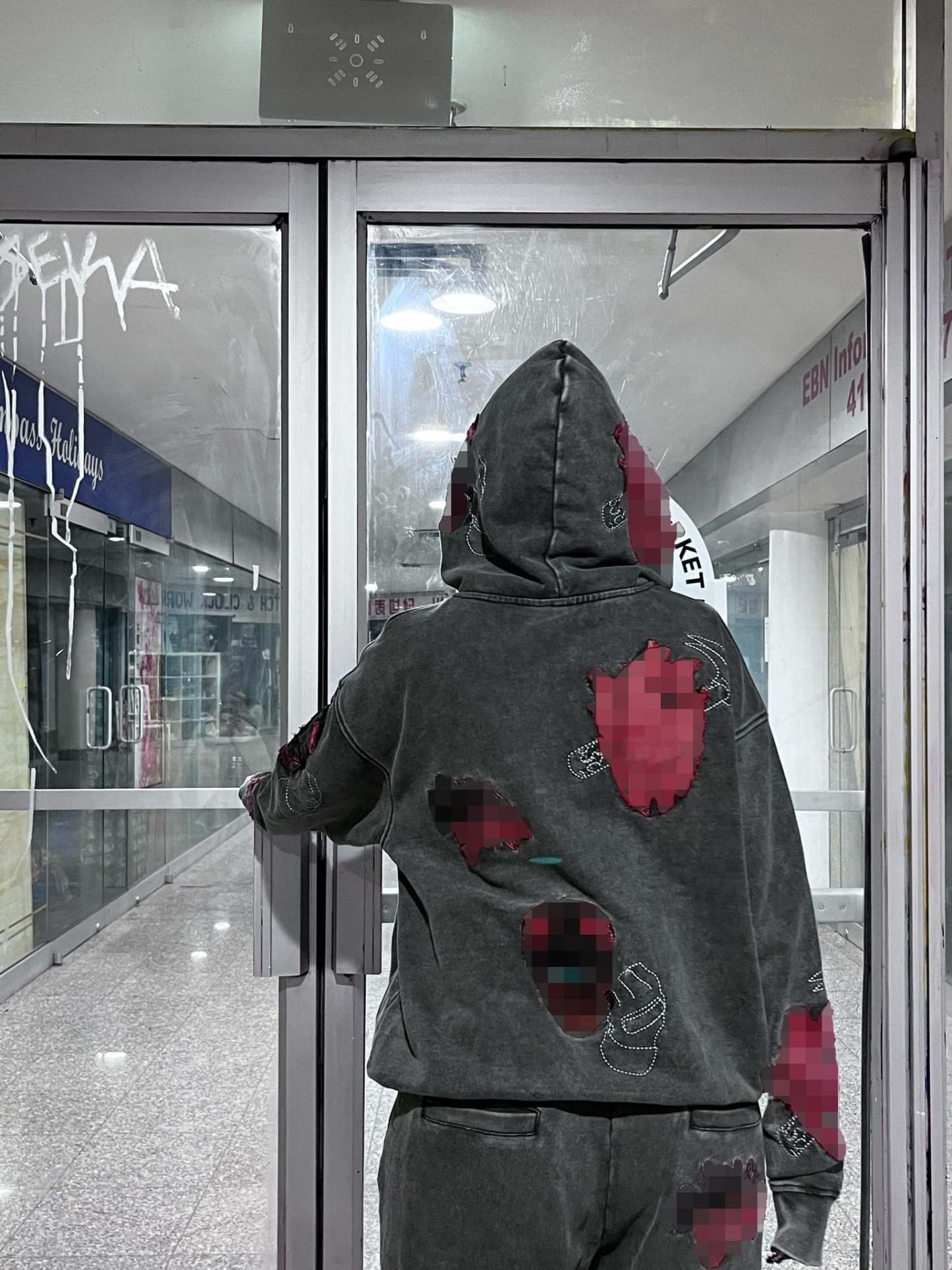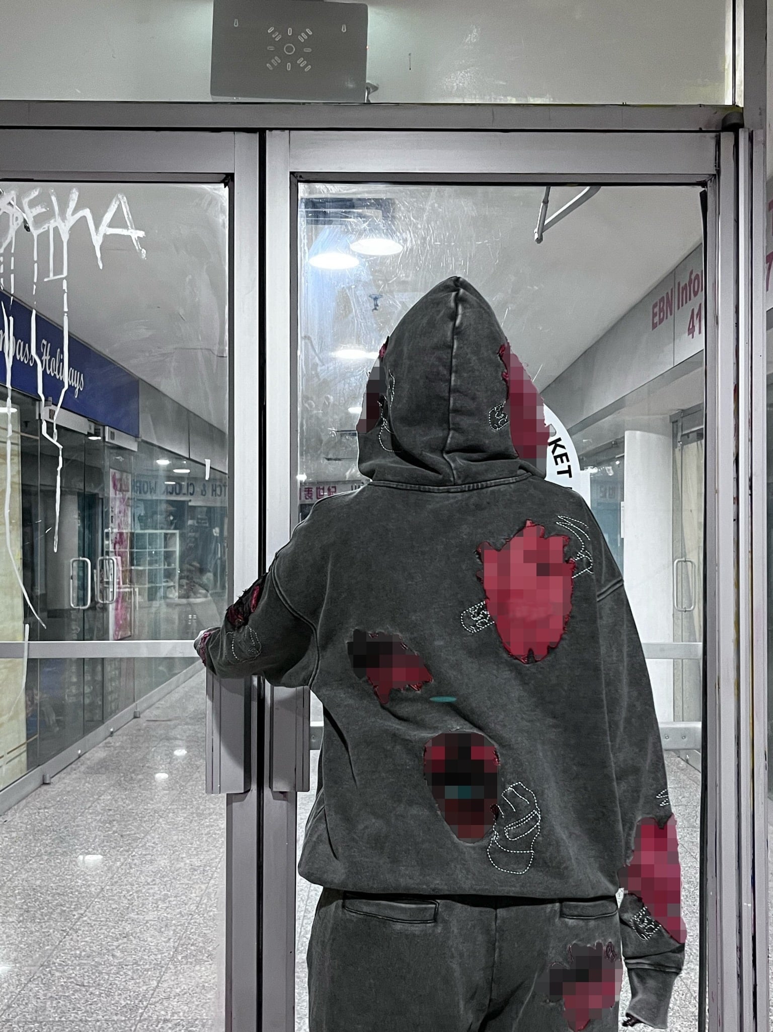 This is our classic zipup hoodie made of double-layer thick acid-washed French terry. Embroideries and prints on both sides. The hoodie has 7 pockets on the chest and sleeves. The hood has a full zipline. The left sleeve has a rubber patch embroidery