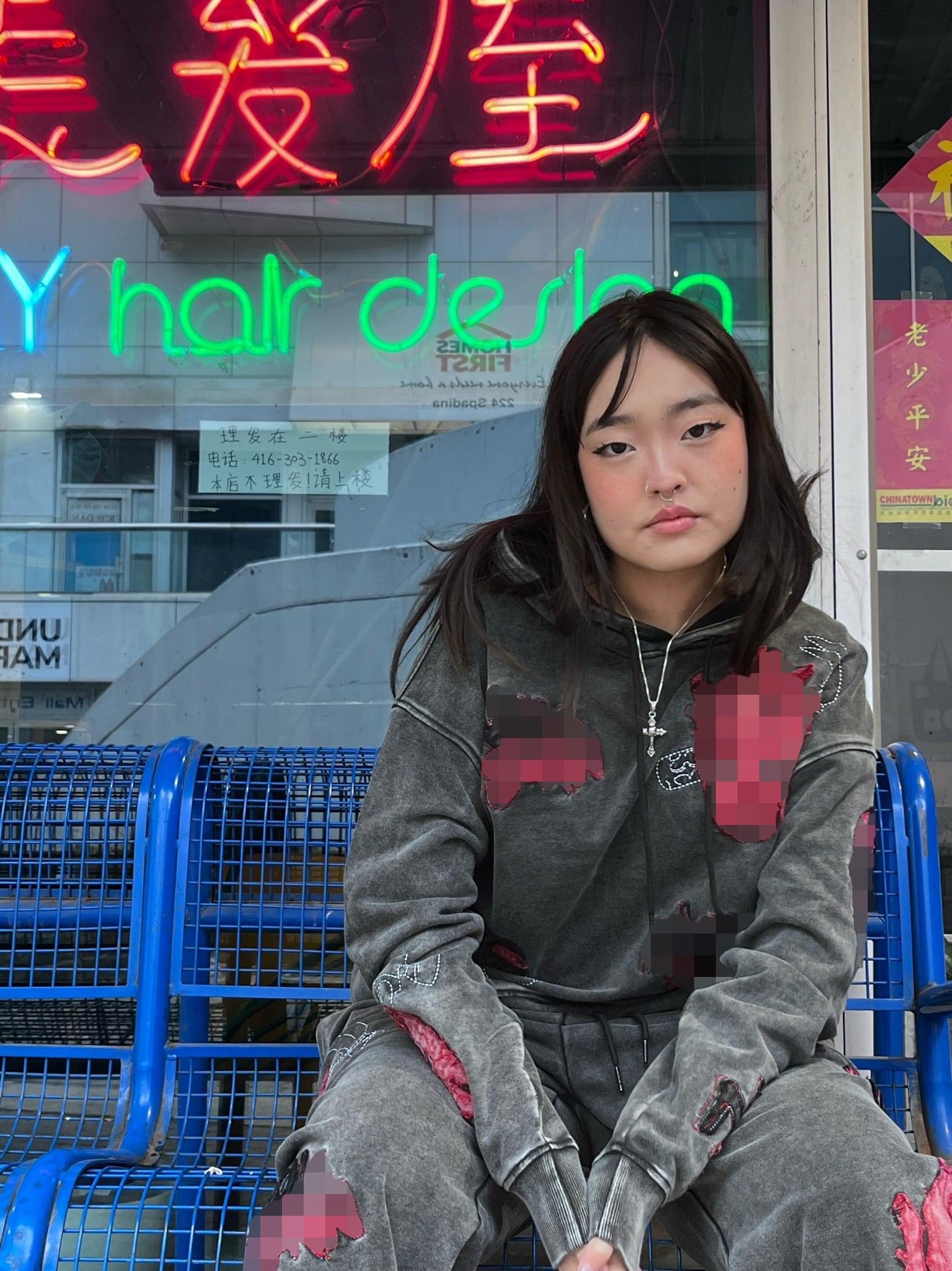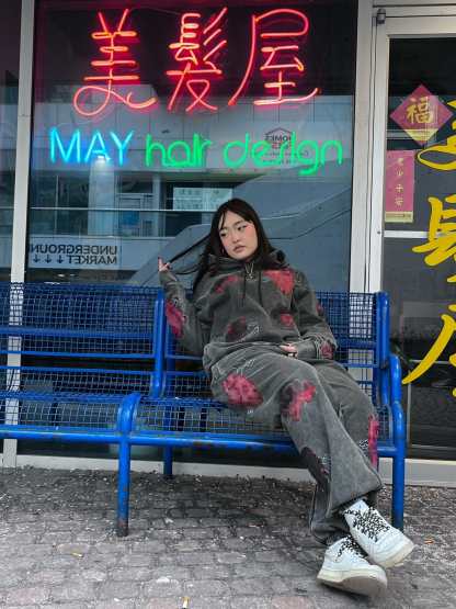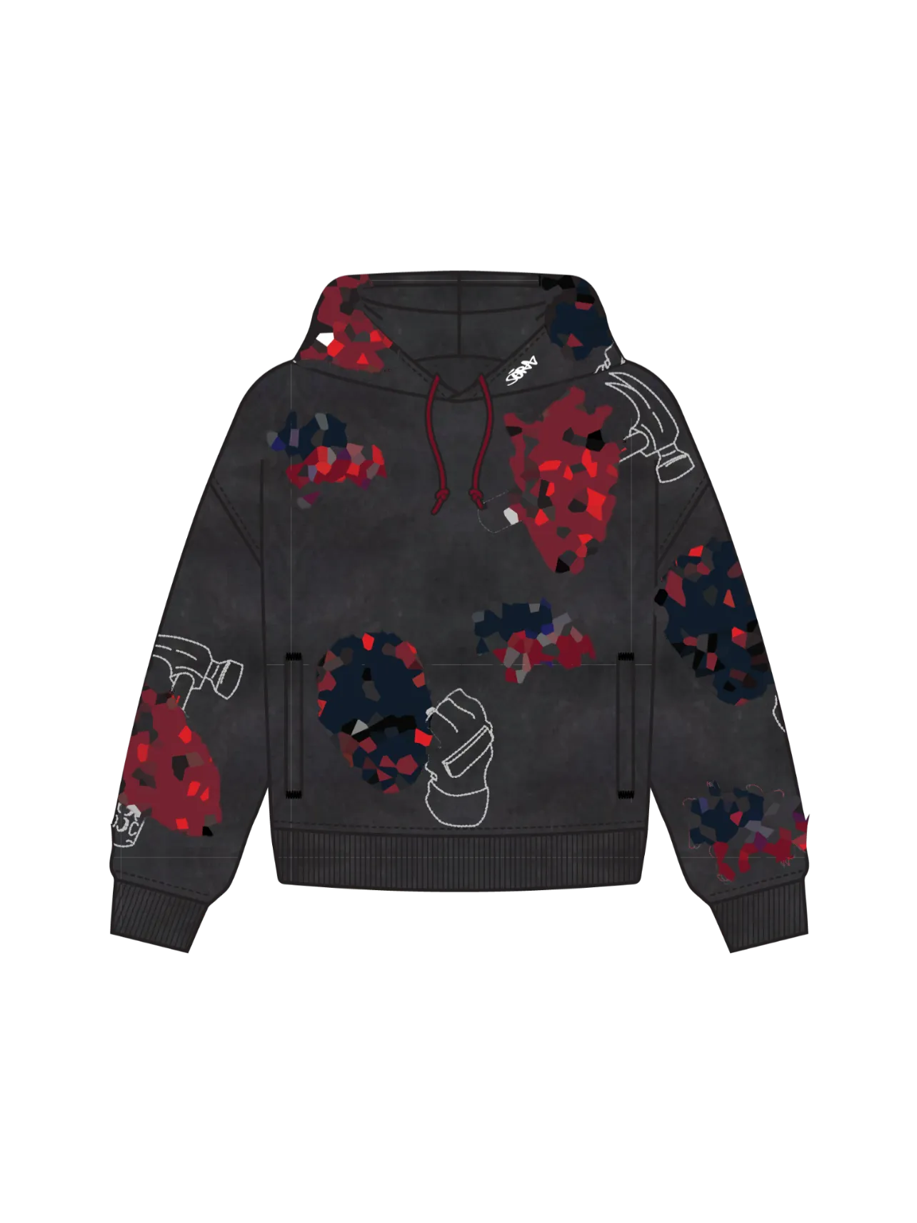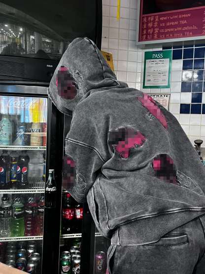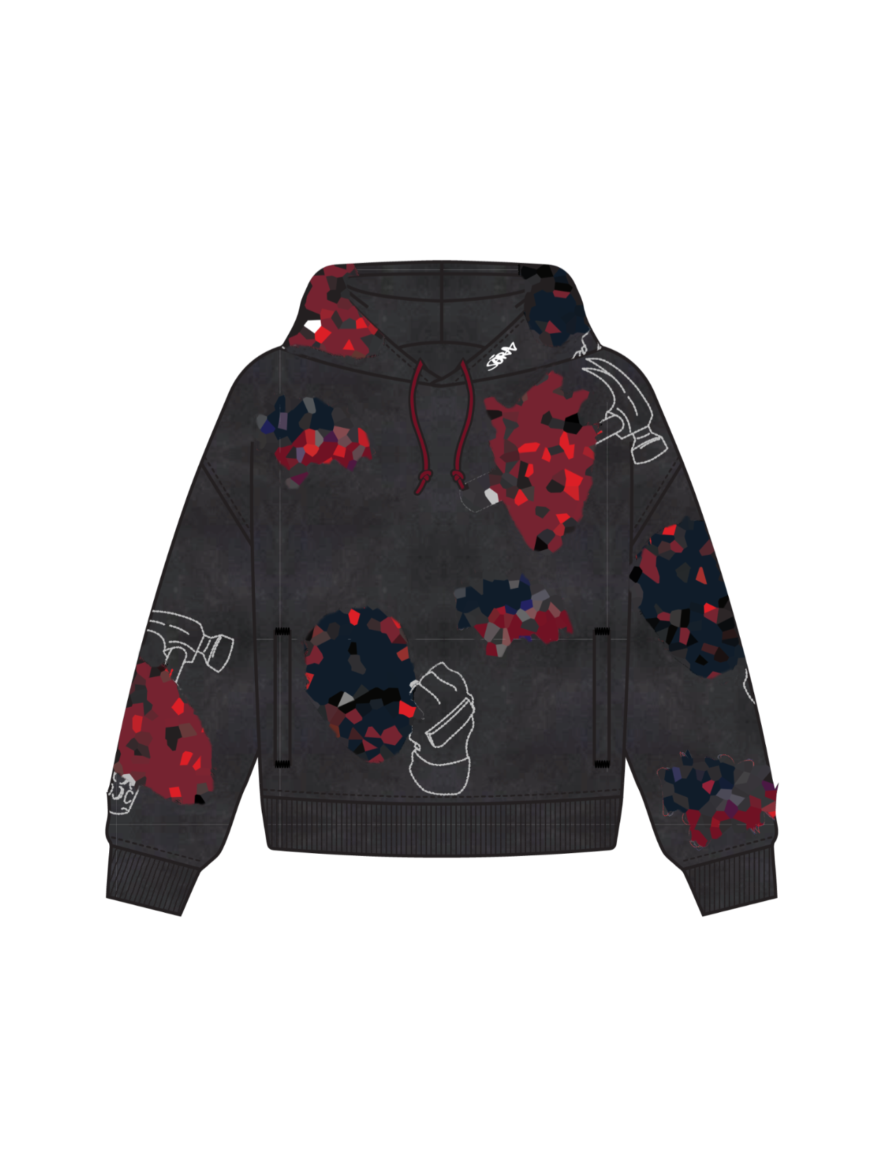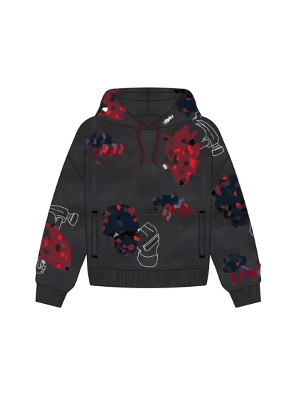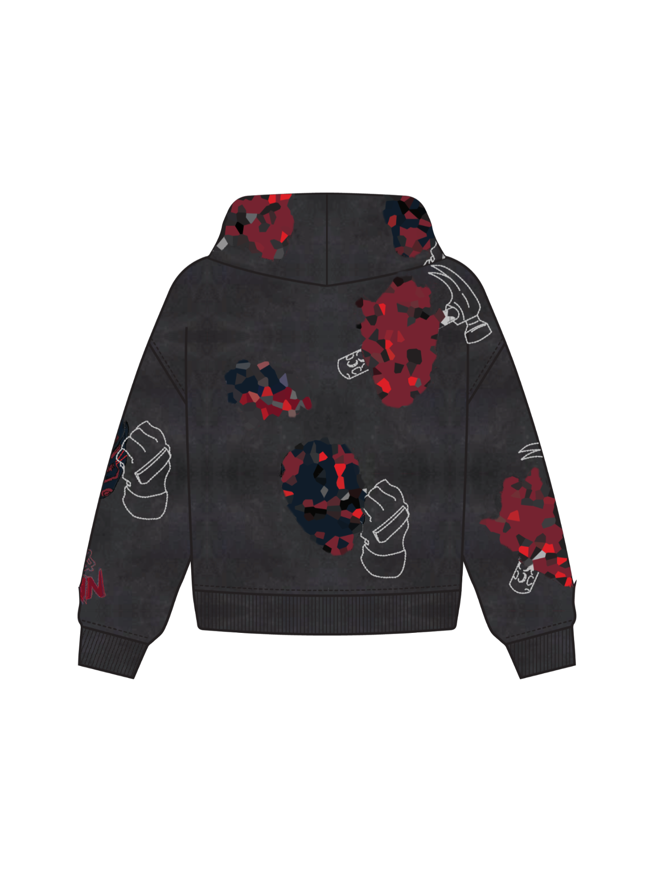 This is our classic zipup hoodie made of double-layer thick acid-washed French terry. Embroideries and prints on both sides. The hoodie has 7 pockets on the chest and sleeves. The hood has a full zipline. The left sleeve has a rubber patch embroidery