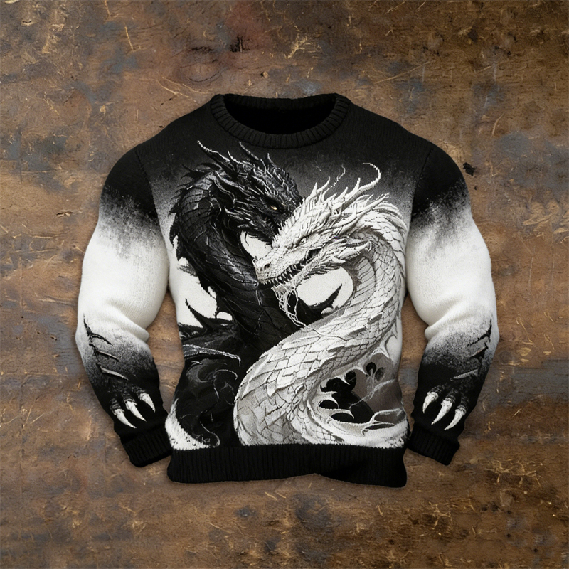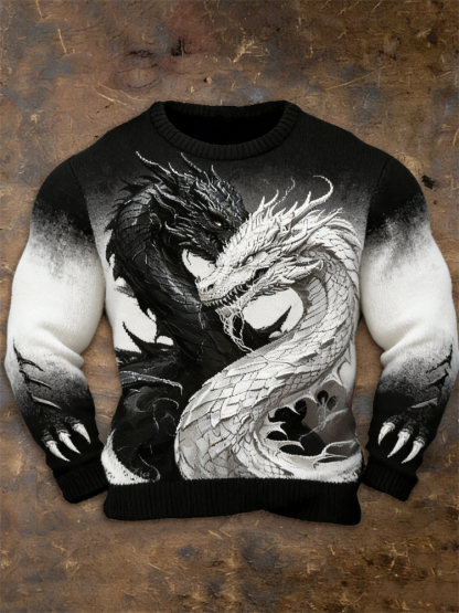 Men's Black & White Dragons Contrast Gradient Cozy Knit Sweater