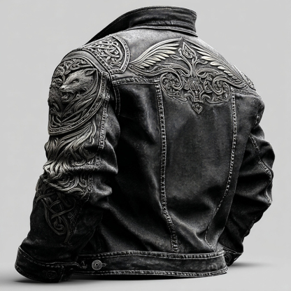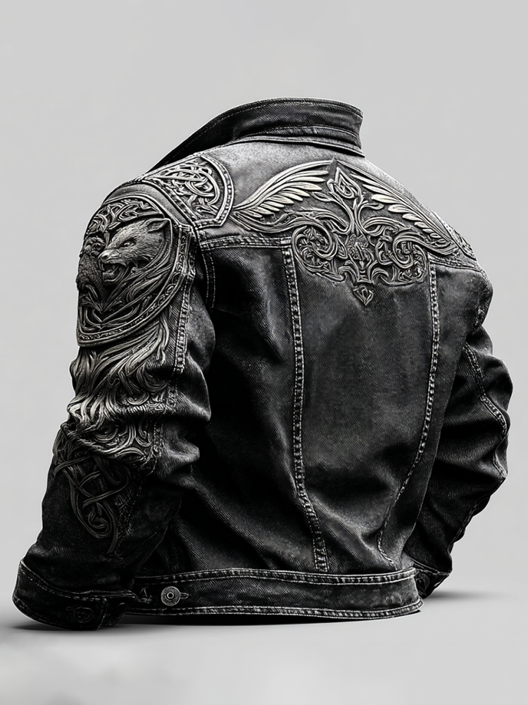 Men's Retro Celtic Knot And Wolf Art Pattern Washed Denim Jacket