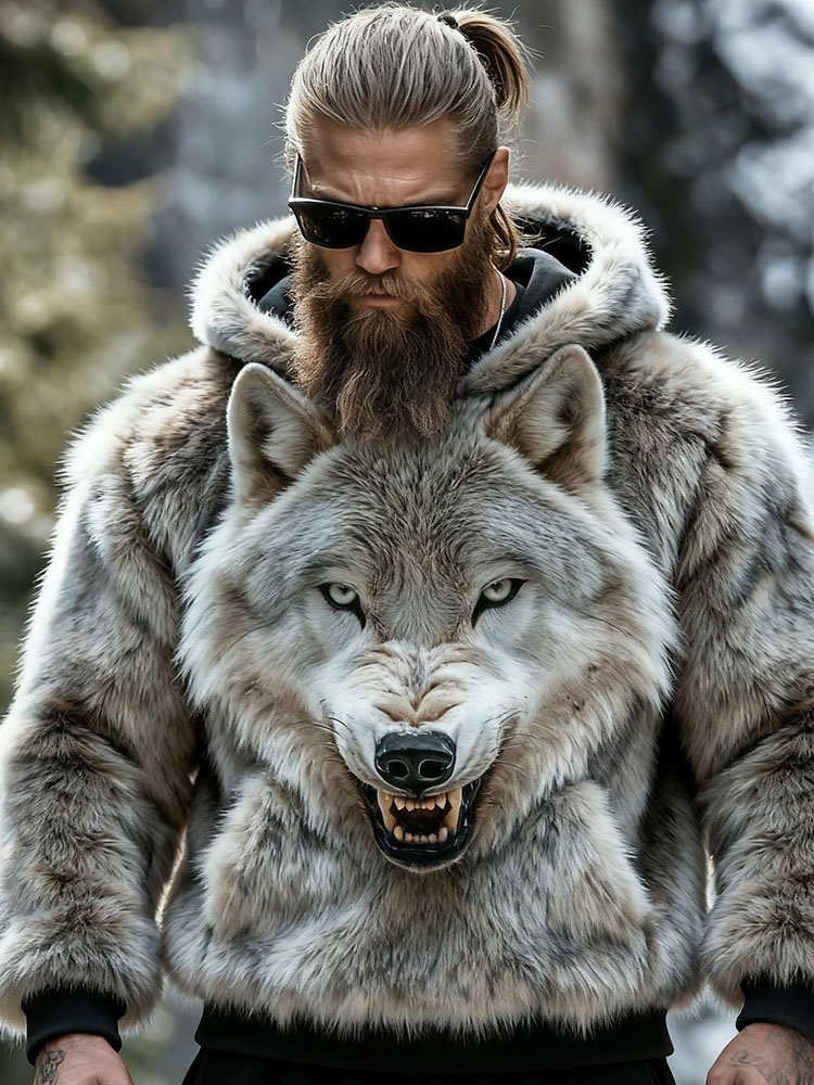 Men's Retro Tribal Wolf Head Pattern Lambswool Hoodie