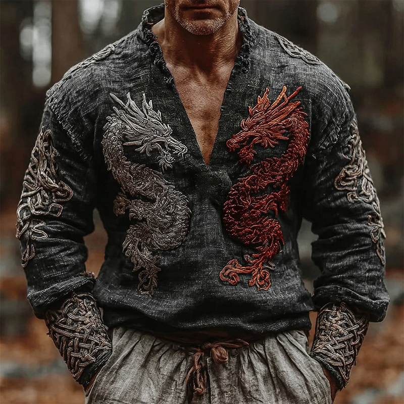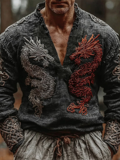 Men's Retro Viking Celtic Dragon Pattern Casual Linen Shirt