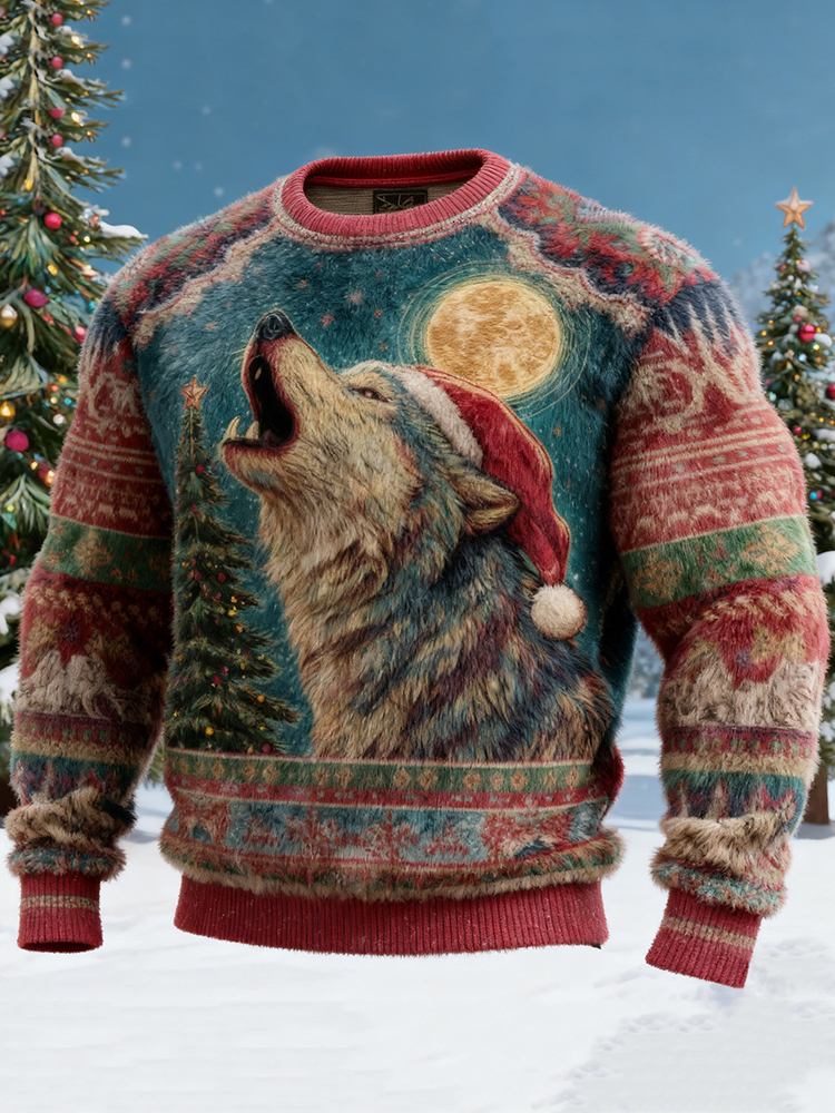Men's Retro Viking Christmas Wolf Art Crew Neck Flannel Sweatshirt