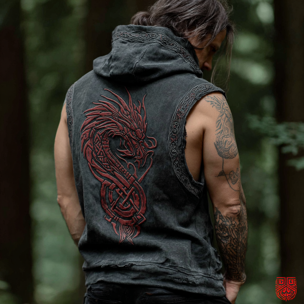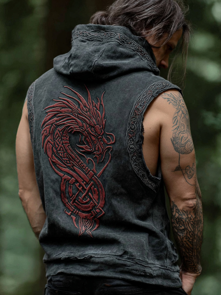 Men's Retro Viking Dragon Rune Loose Fit Hooded Vest