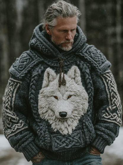 Men's Retro Viking Style Celtic Knot Wolf Head Pattern Hooded Sweater