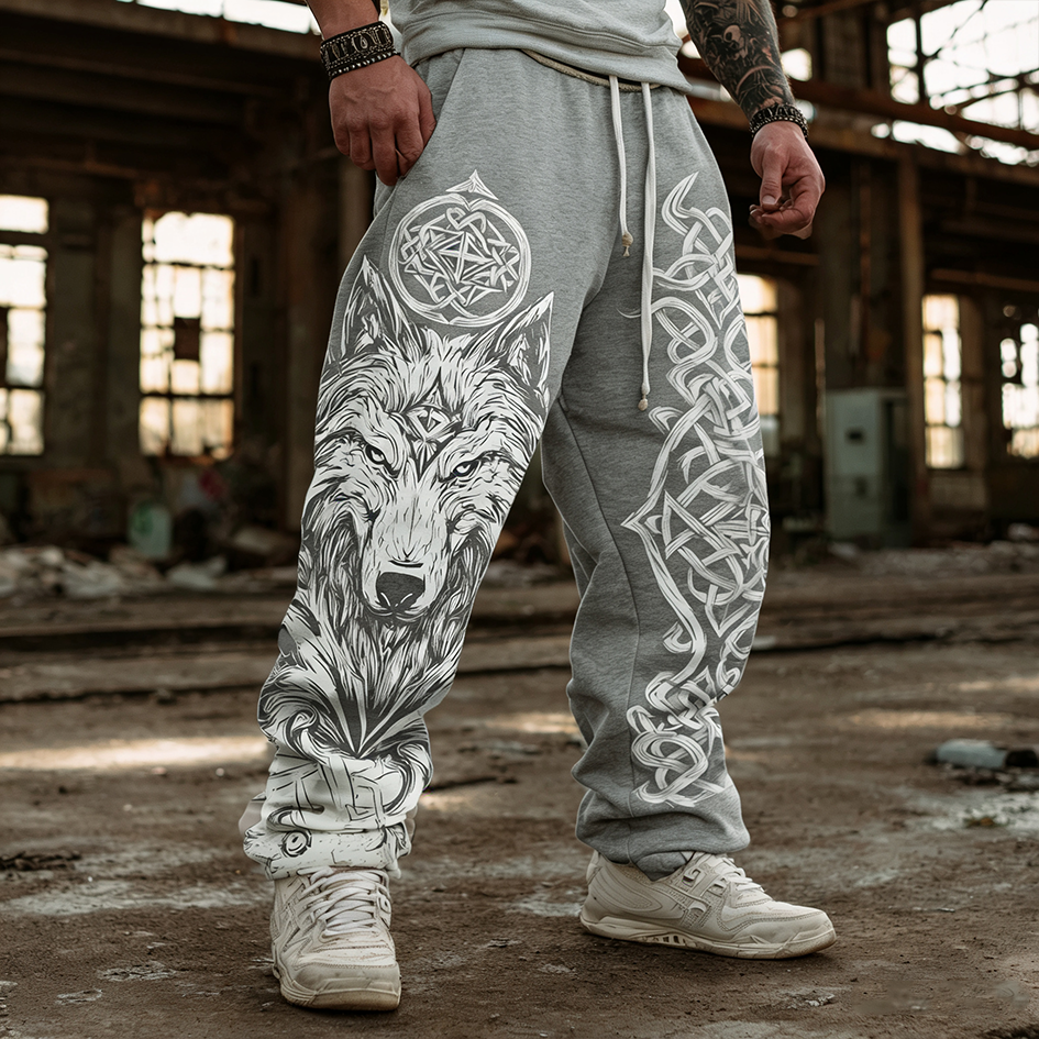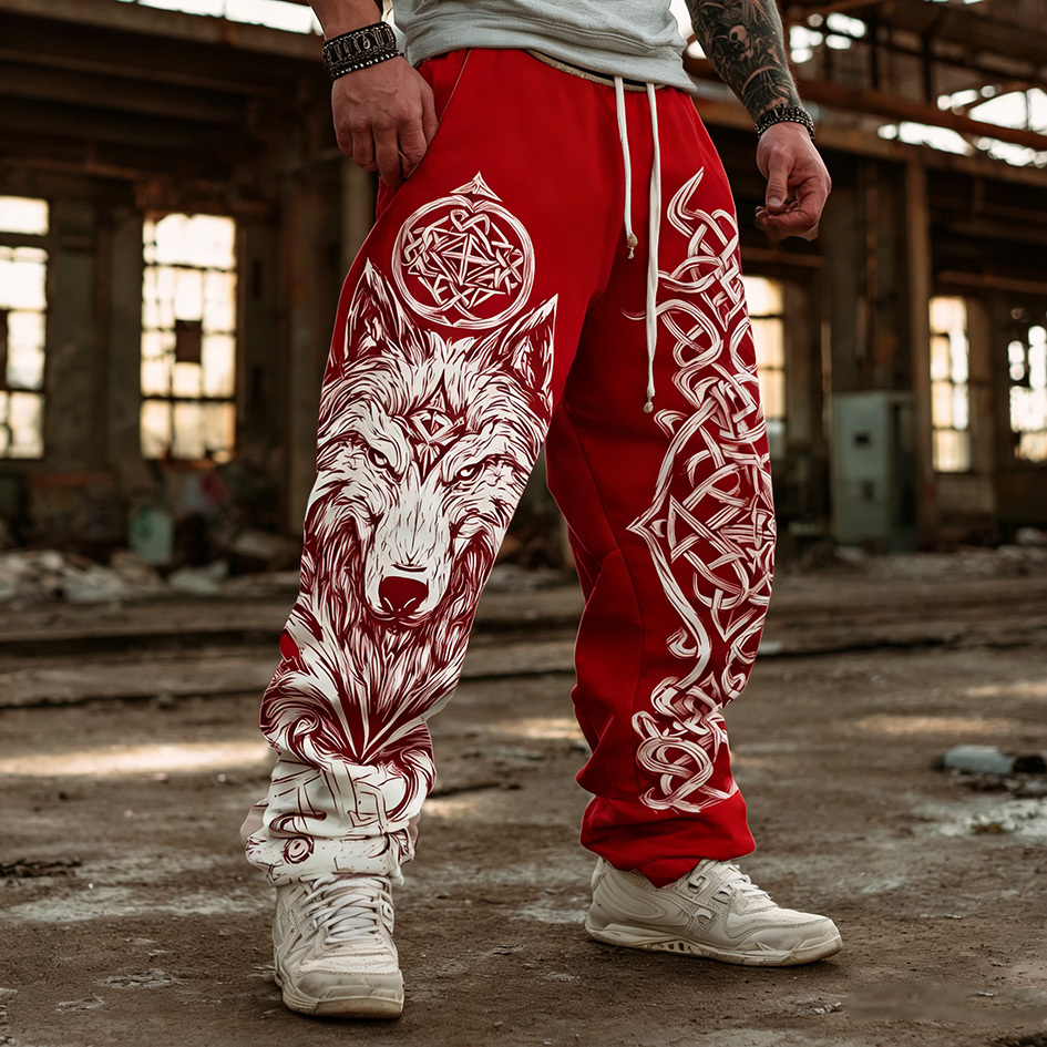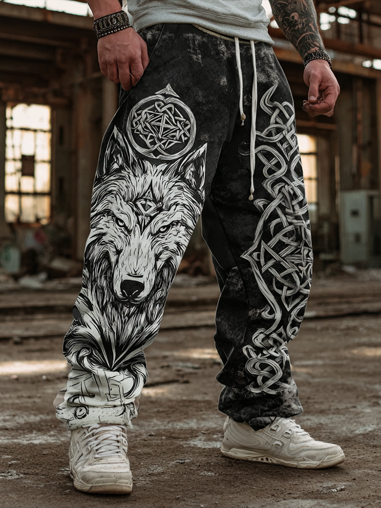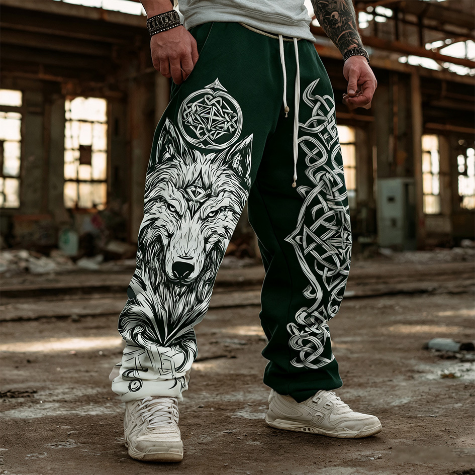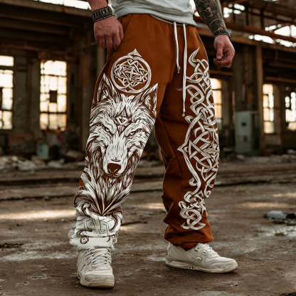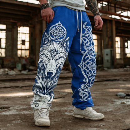 Men's Retro Viking Style Wolf Head Print Casual Sports Long Pants