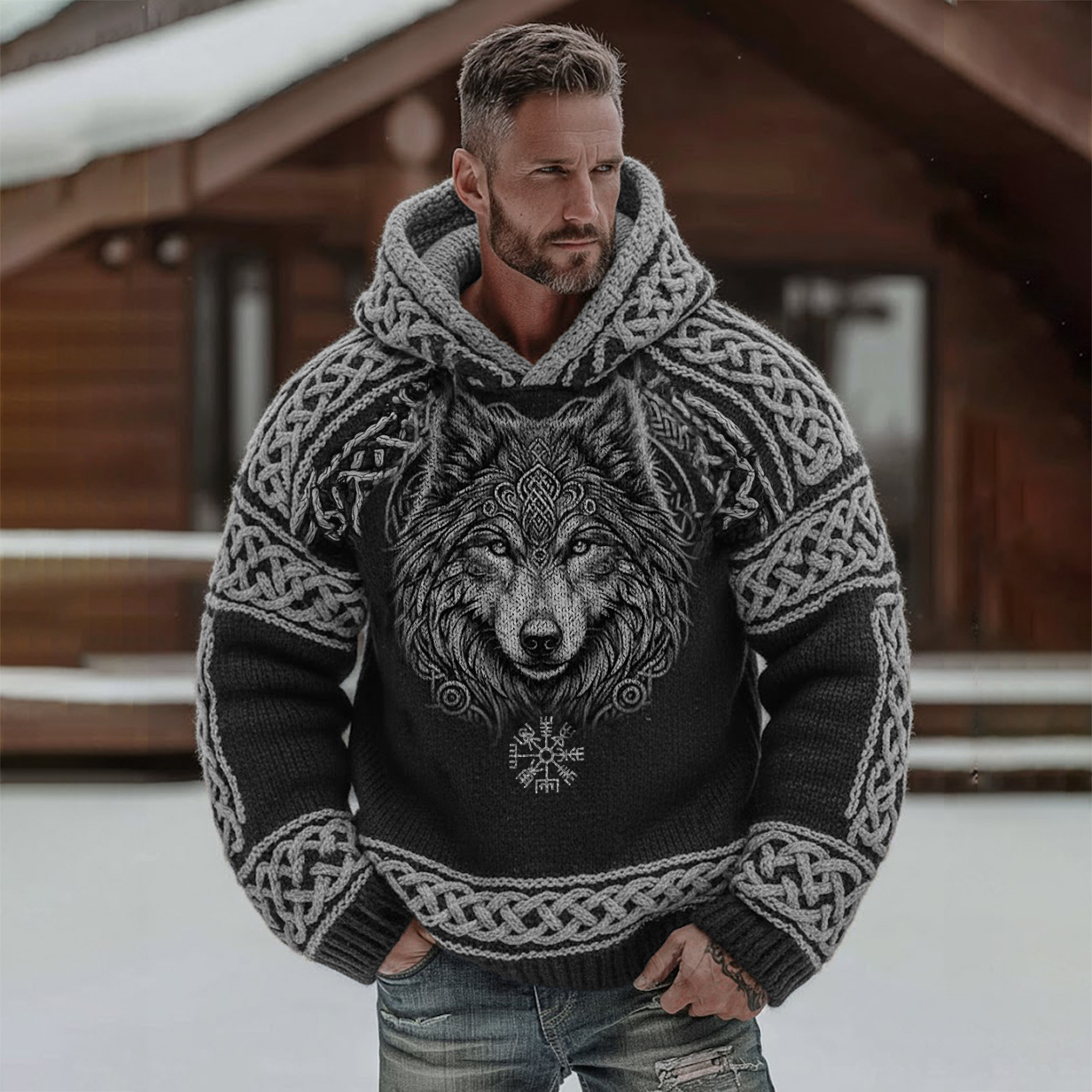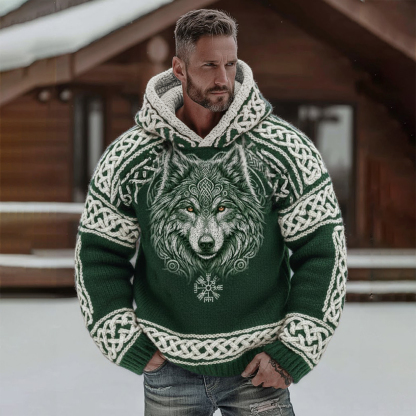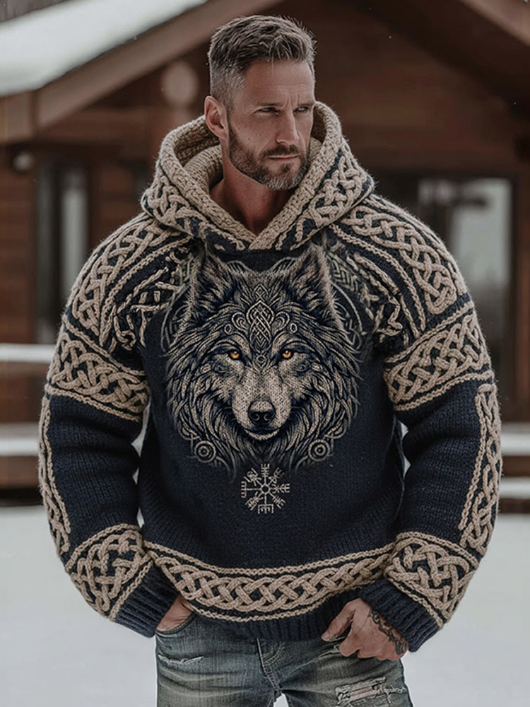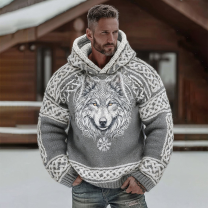 Men's Retro Viking Wolf Celtic Knot Pattern Cozy Knit Hooded Sweater