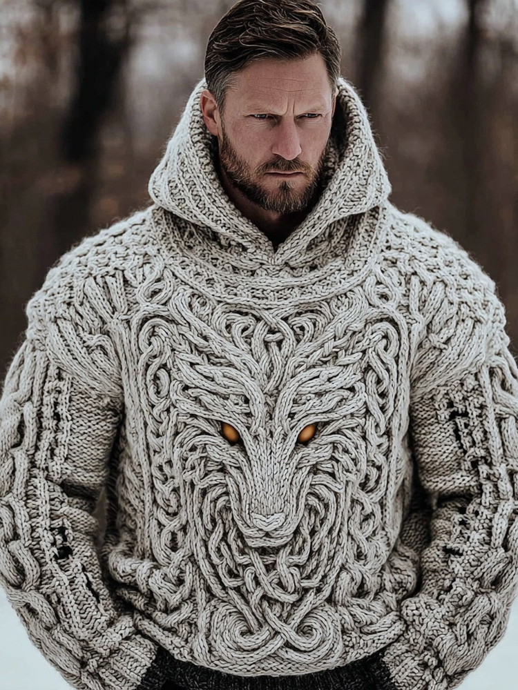 Men's Viking Celtic Dragon Pattern Chunky Knit Hooded Sweater