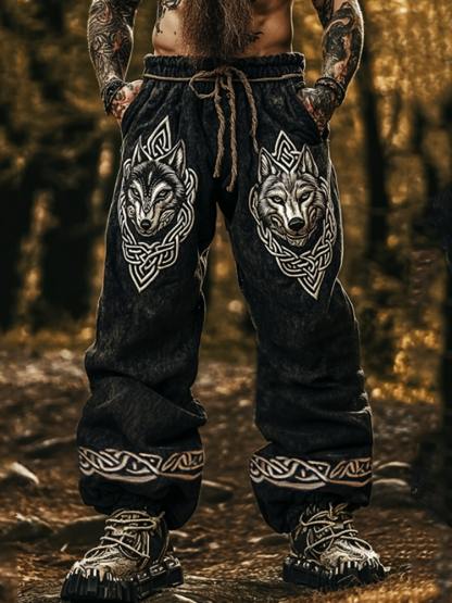 Men's Viking Celtic Knot And Yin Yang Wolf Art Linen Blend Wide Leg Pants