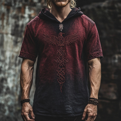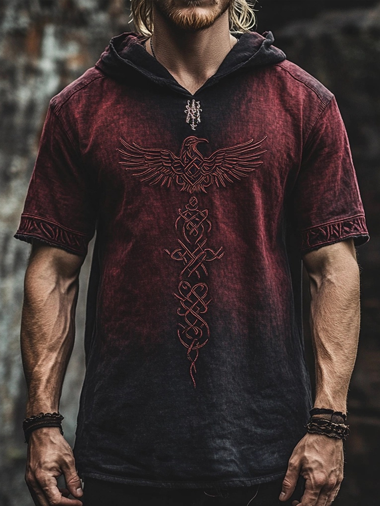 Men's Viking Celtic Raven Embroidered Hooded Linen T Shirt