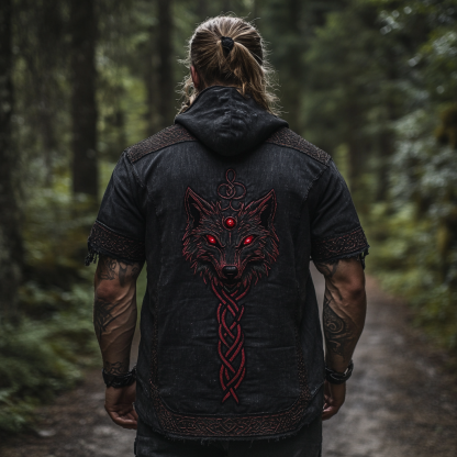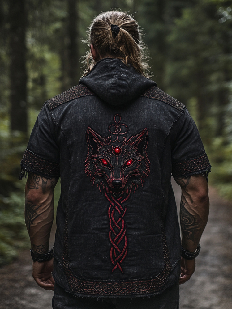 Men's Viking Celtic Wolf Embroidery Linen Casual Hooded Short Sleeve T-shirt