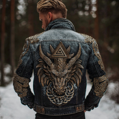 Men's Viking Dragon Art Washed Denim Jacket