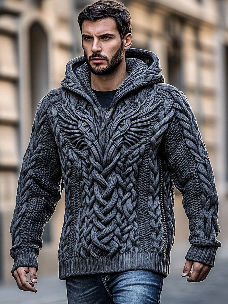 Men's Viking Dragon Celtic Jacquard Chunky Knitted Cozy Hooded Sweater