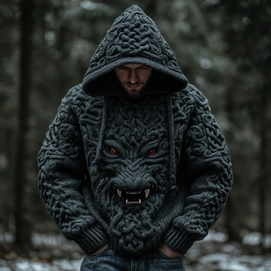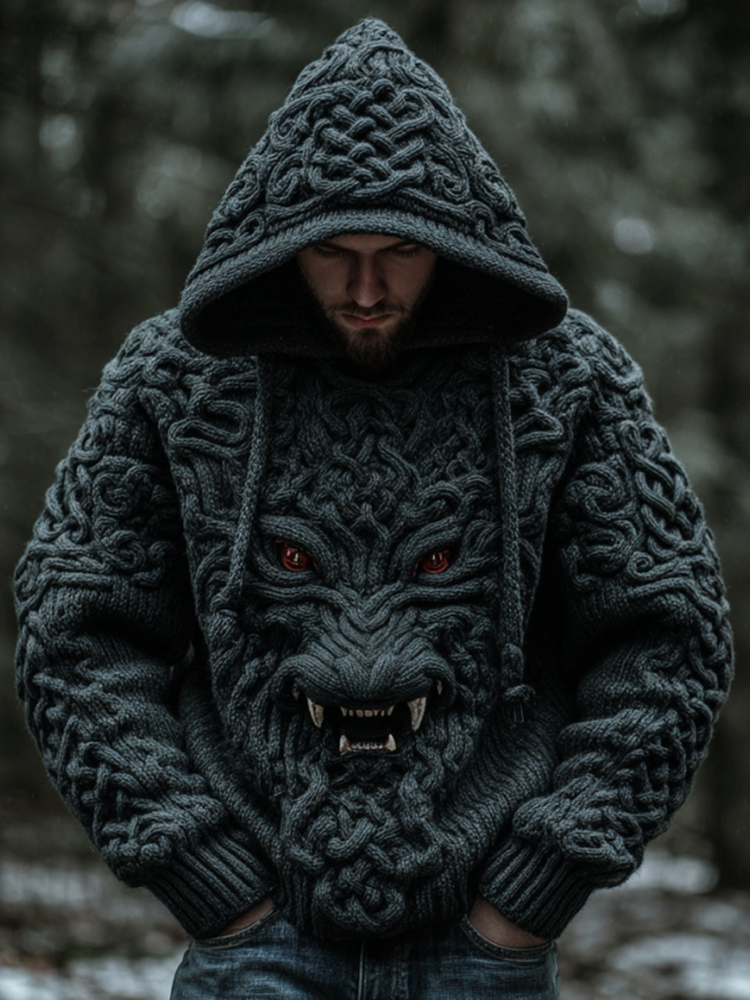 Men's Viking Dragon Style Celtic Jacquard Knitted Hooded Sweater