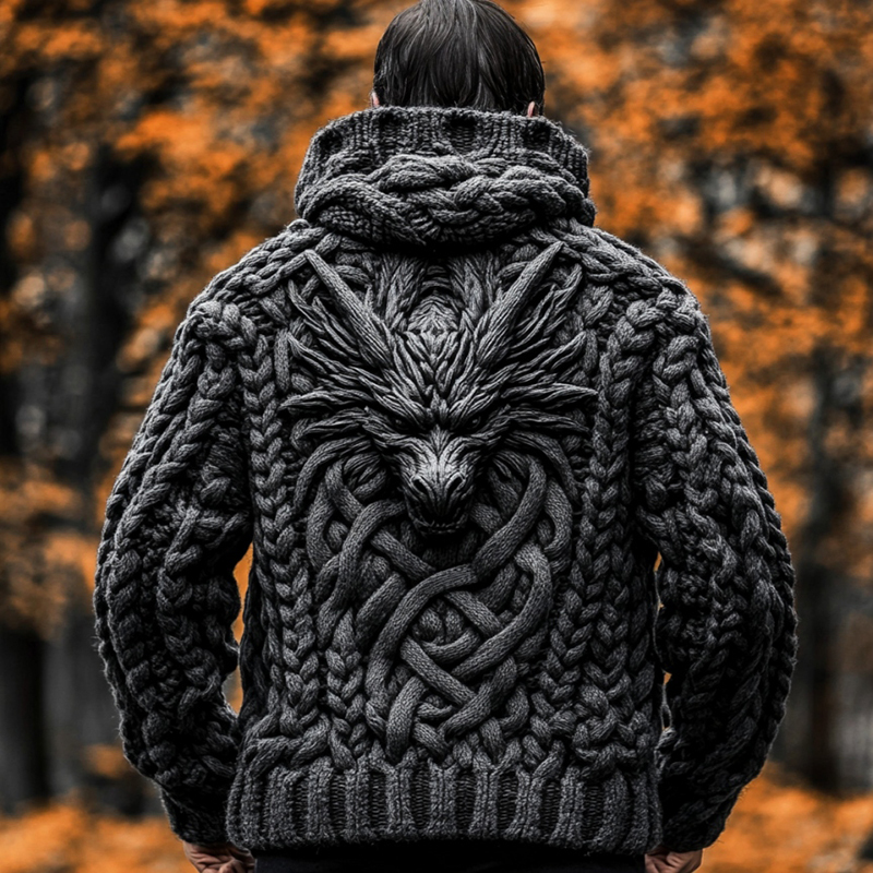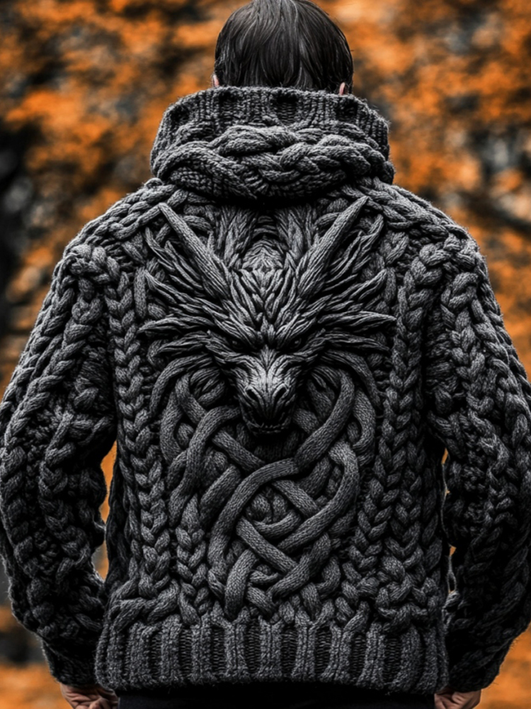 Men's Viking Dragon Totem Chunky Knit Hooded Cardigan