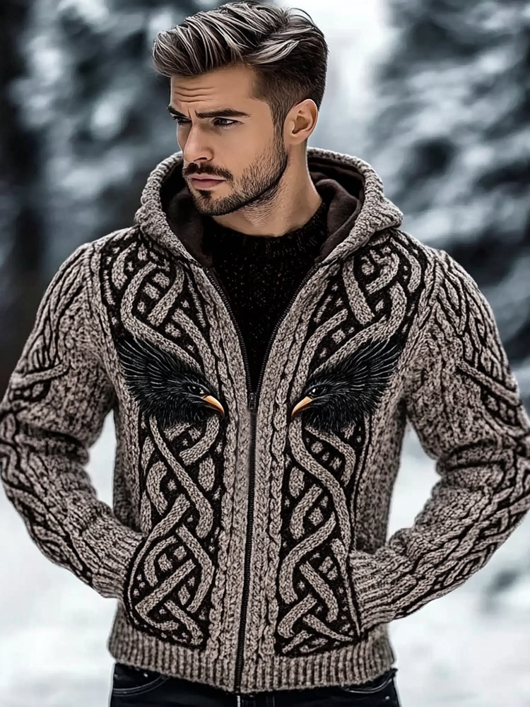 Men's Viking Raven Jacquard Celtic Chunky Knit Zipper Cardigann