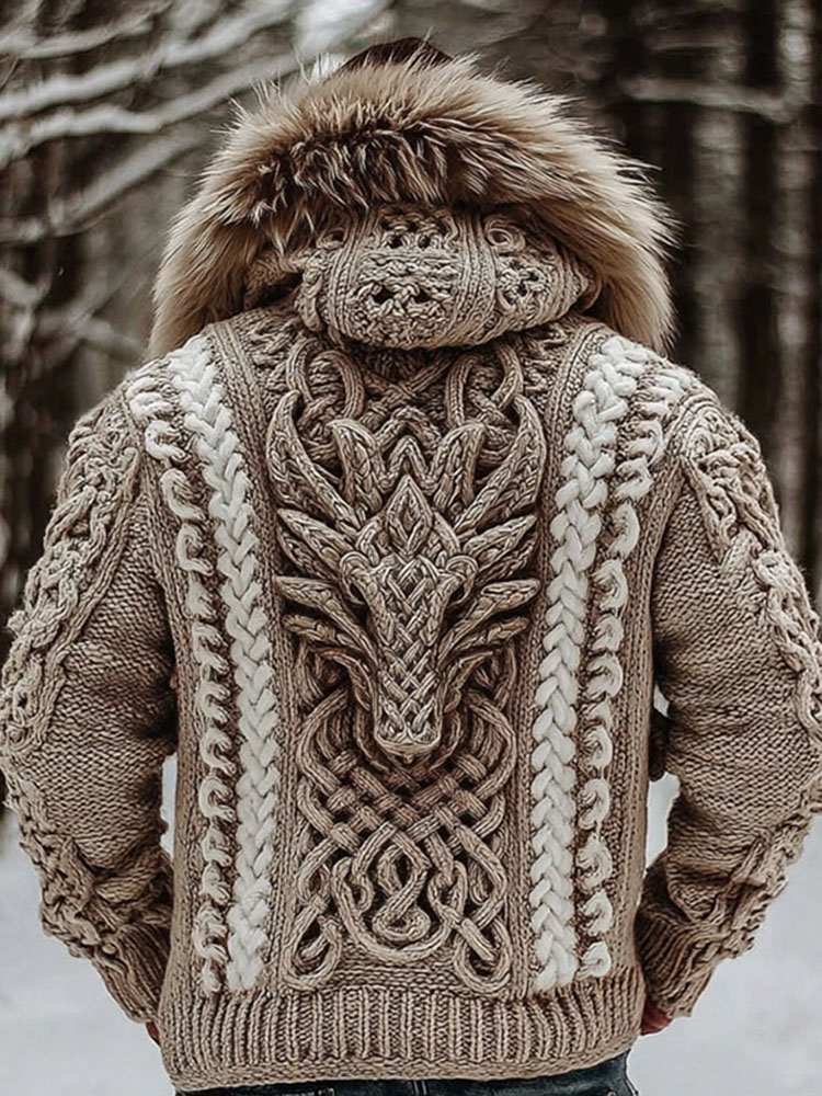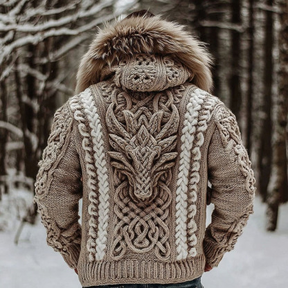 Men's Viking Tribal Dragon Celtic Chunky Knit Fuzzy Hooded Zipper Cardigan