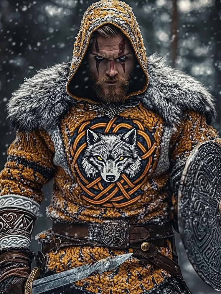Men's Viking Wolf Jacquard Celtic Style Knitted Hooded Sweater