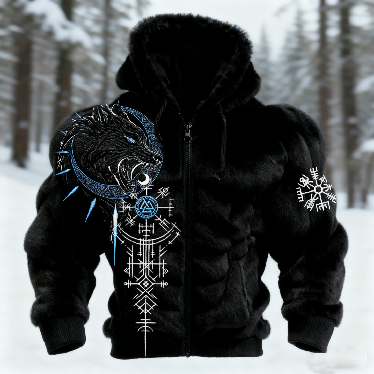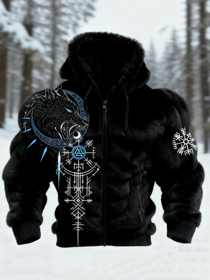 Men's Viking Wolf Totem Graphic Art Cozy Flannel Zip-up Hoodie