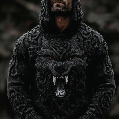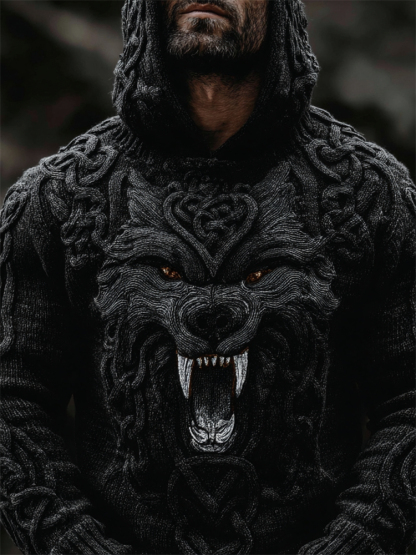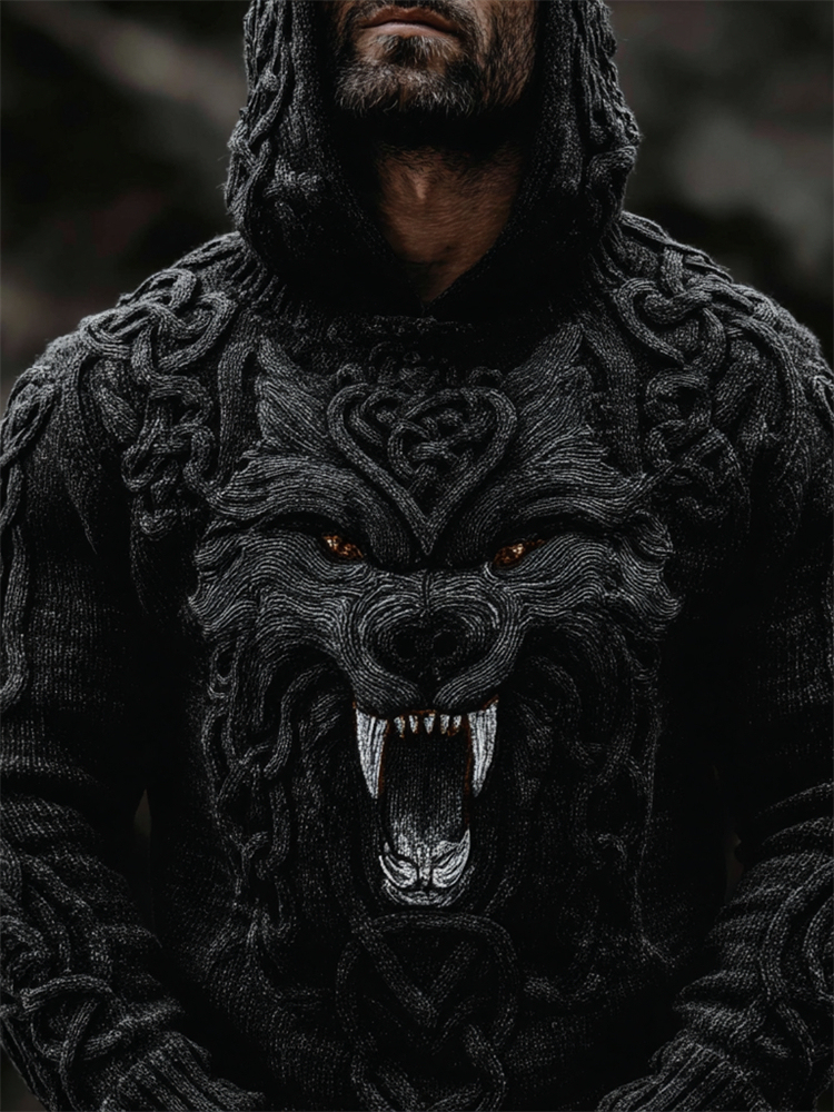 Men's Viking Wolf With Fangs Celtic Knot Chunky Hooded Sweater
