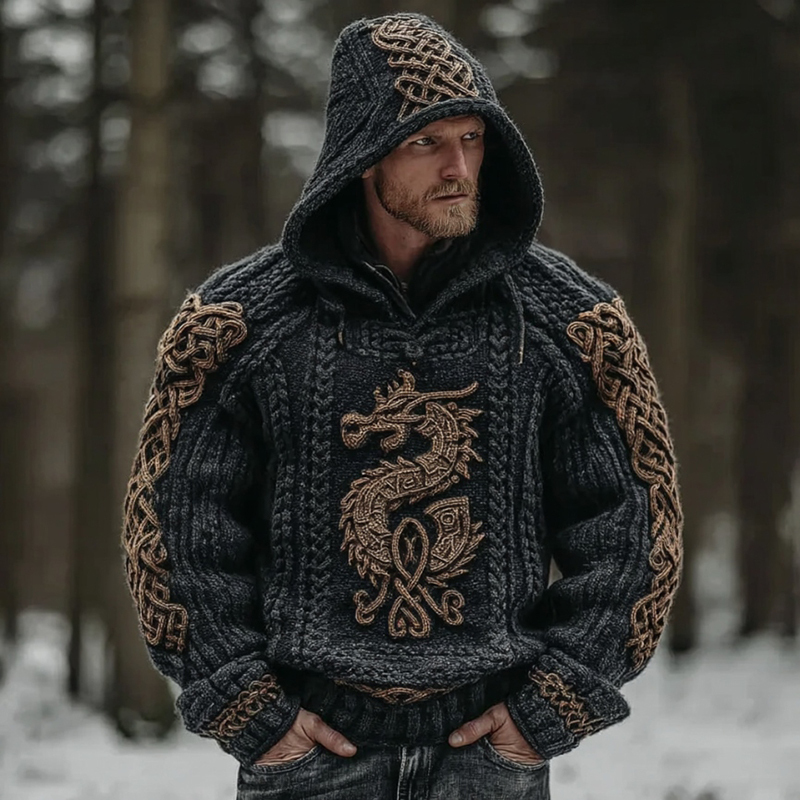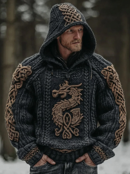 Men's Vintage Viking Dragon Celtic Art Jacquard Knitted Cozy Hooded Sweater