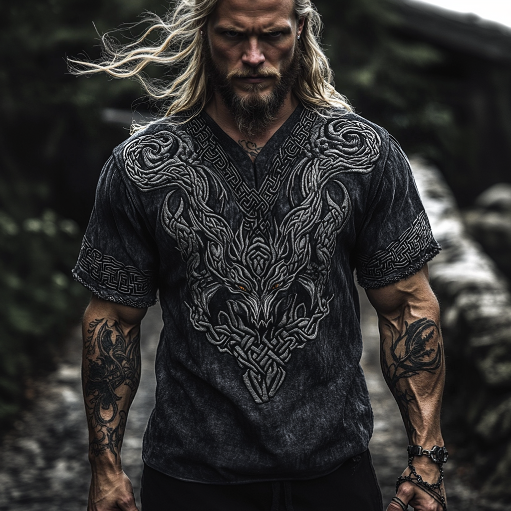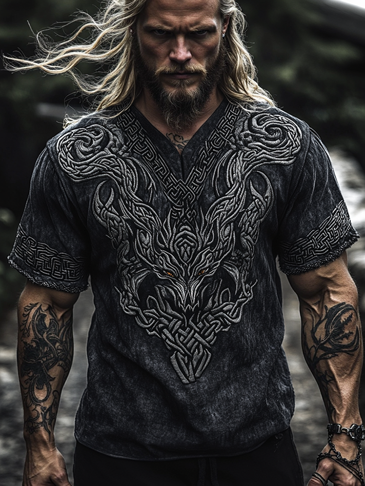 Men's Vintage Viking Dragon Celtic Knot Print Linen Blend T-shirt