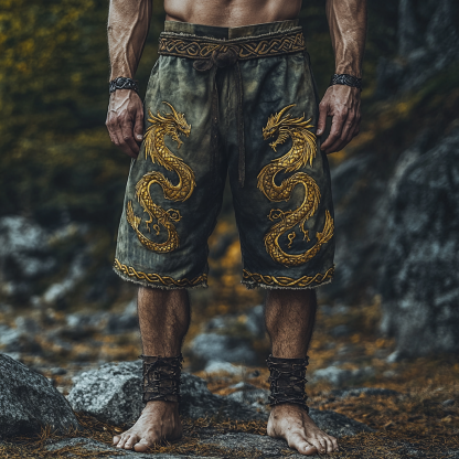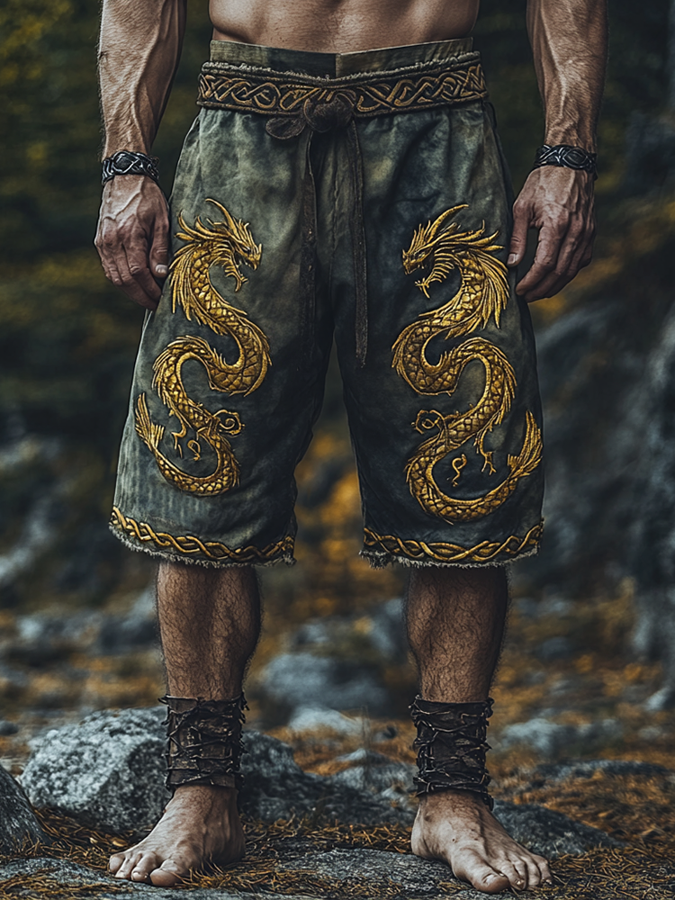 Men's Vintage Viking Golden Dragon In Celtic Knot Art Tie Dye Casual Linen Shorts