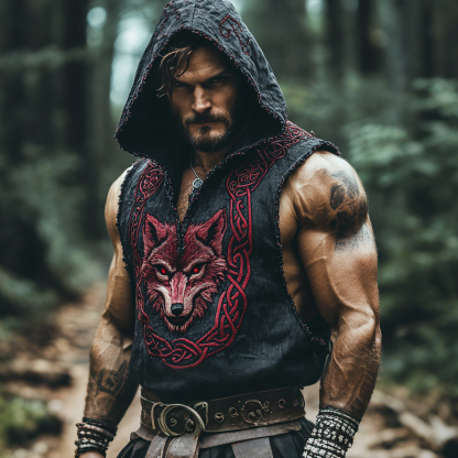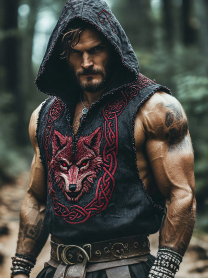 Men's Vintage Viking Wolf Celtic Pattern Linen Sleeveless Hooded T-shirt