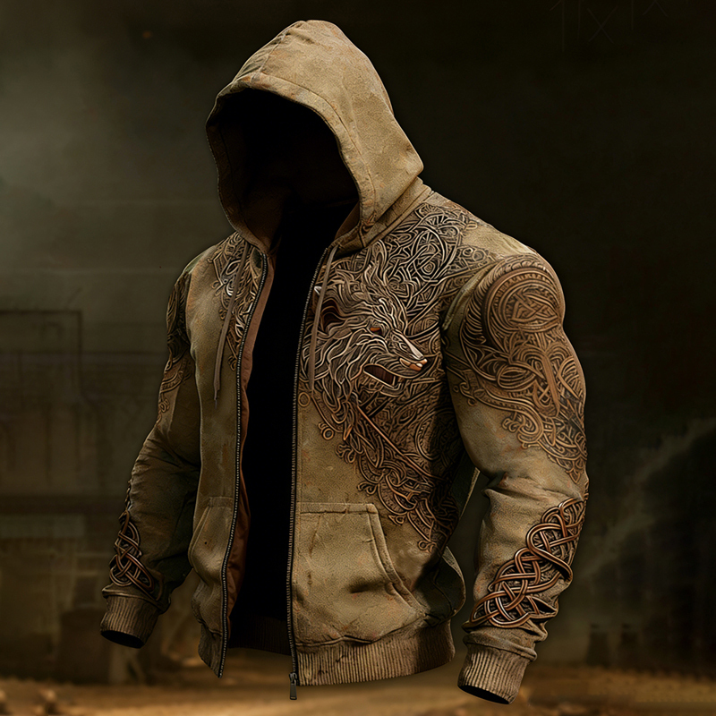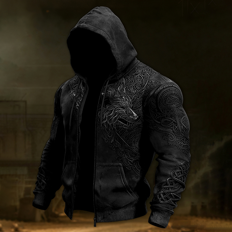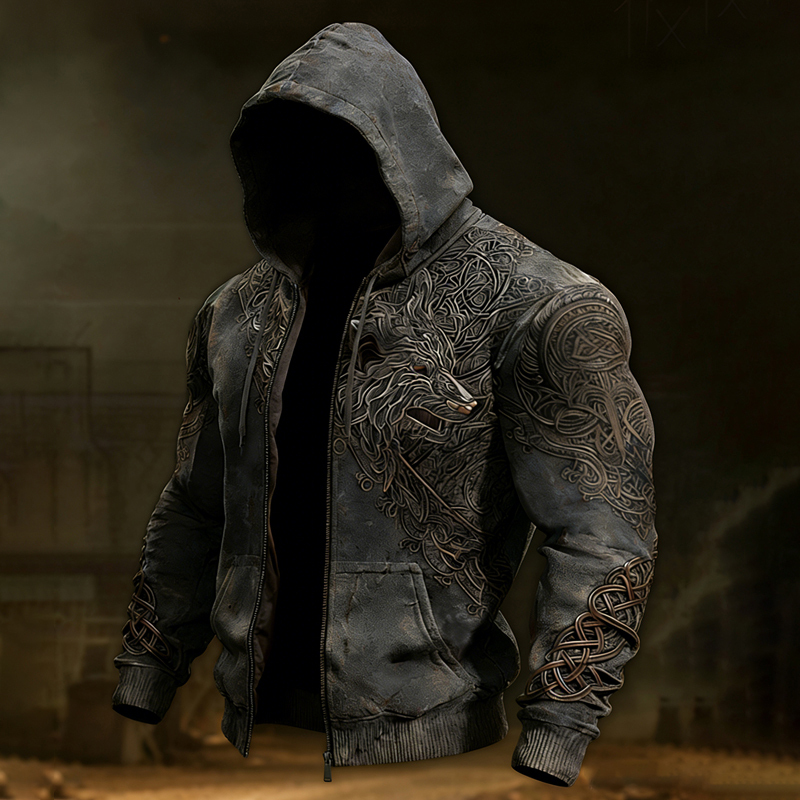 Men's Vintage Viking Wolf Celtic Zipper Up Casual Hoodie