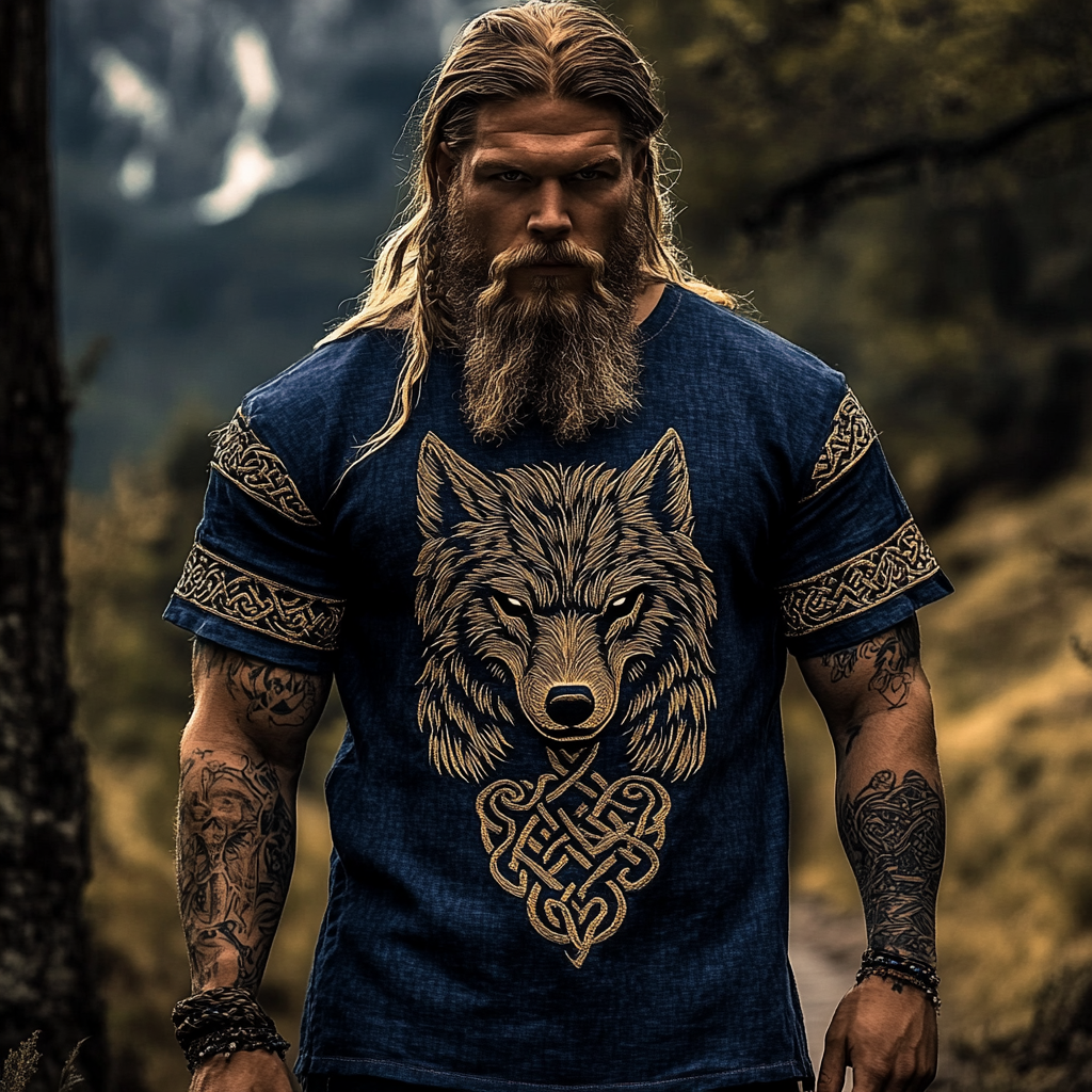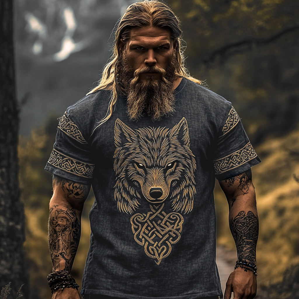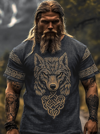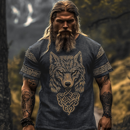 Men's Vintage Viking Wolf Pattern Linen Blend T-shirt