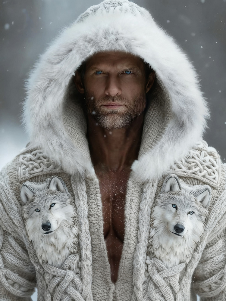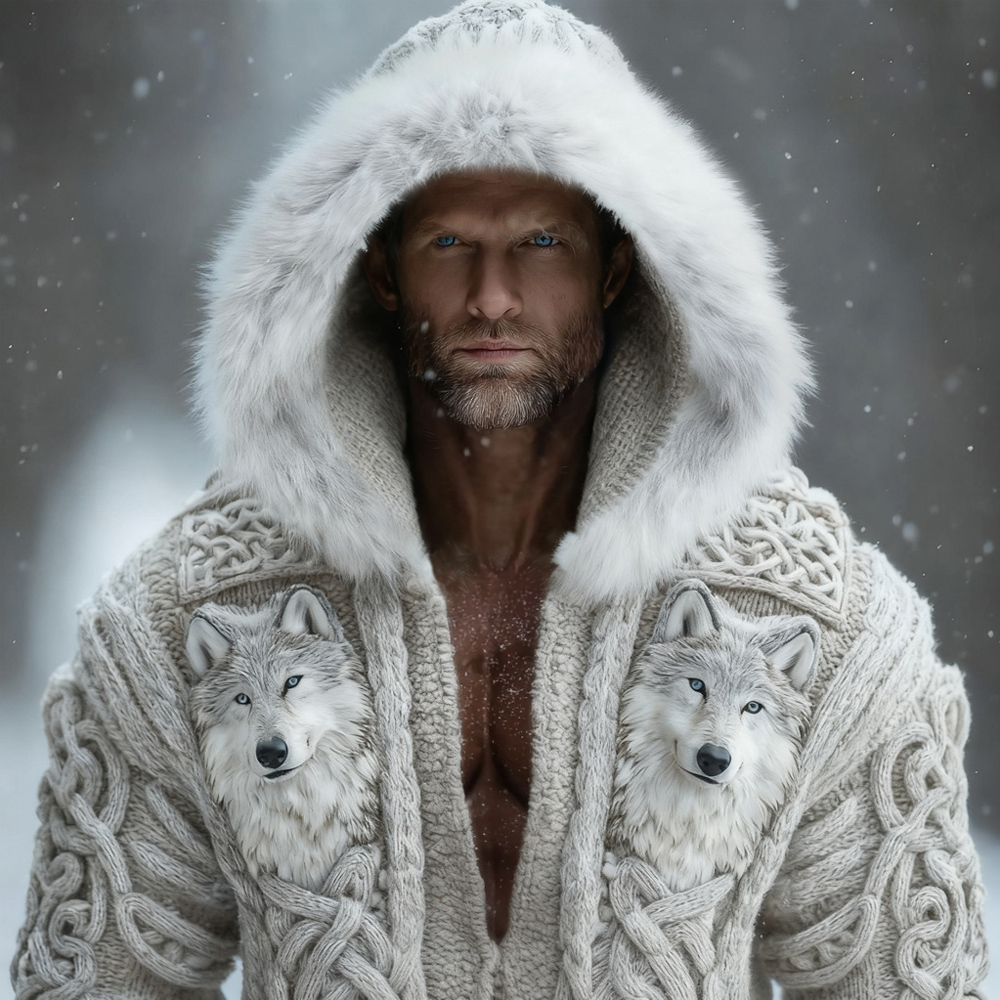 Men's Vintage Wolf Celtic Knot Fur Trim Cozy Hooded Sweater
