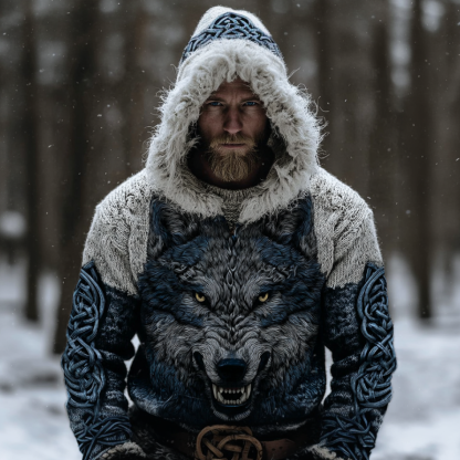 Men's Winter Wolf Retro Viking Style Hooded Knit Sweater