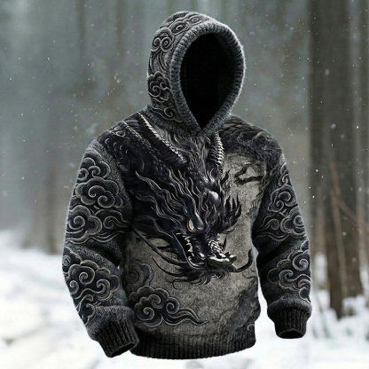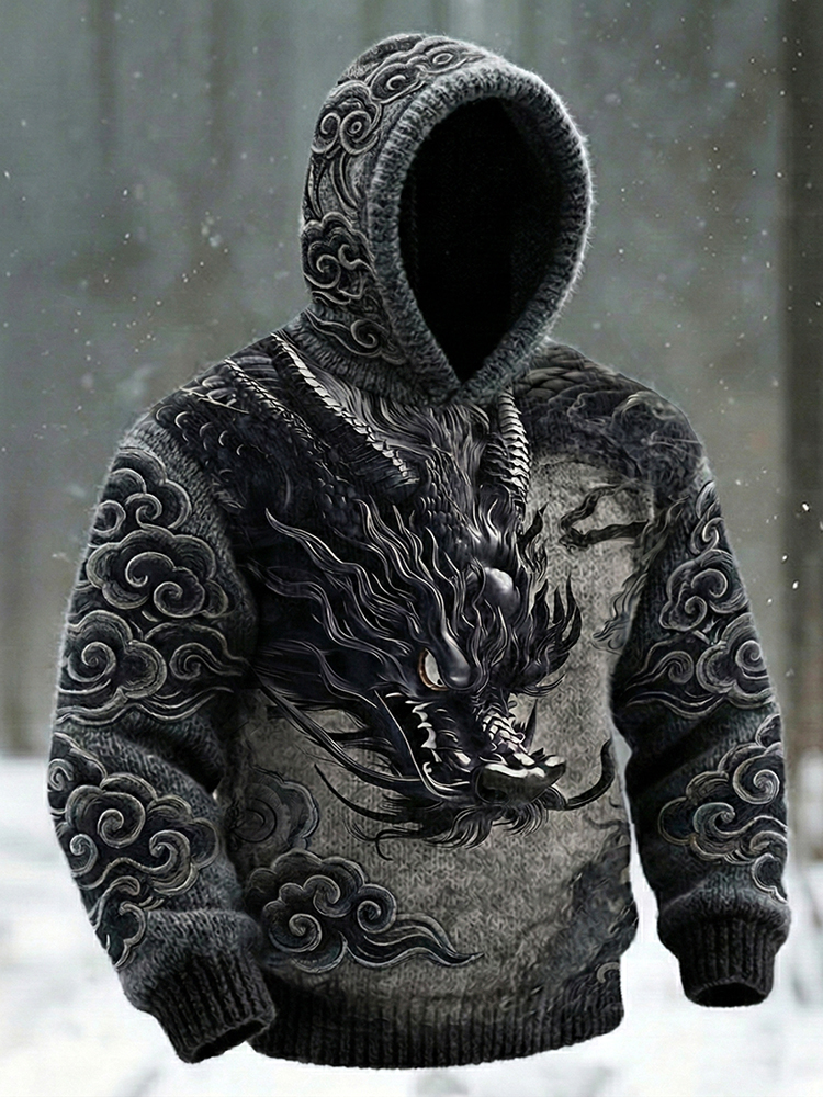 Retro Vintage Dragon Pattern Men's Cozy Hooded Sweater
