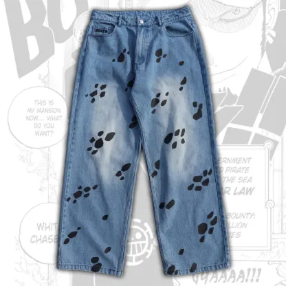 The Trafalgar Law Jeans are true to size with a Relaxed Straight-Leg fit. For a baggy fit, we recommend sizing up from your usual size. For females, we also recommend sizing up to accommodate for hips.