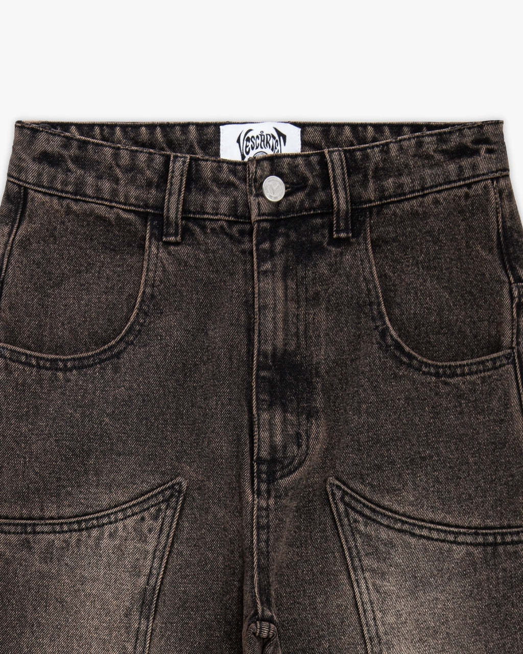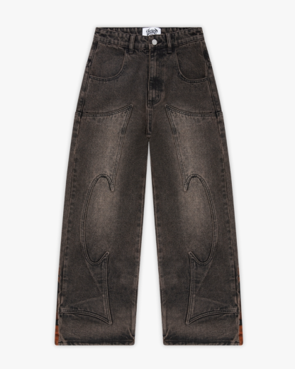 The Thoroughbred Denim presents a cinematic desert tableau, embroidered across the back in over one million stitches — a nomadic figure at rest, his horse and eagle standing watch beneath drifting clouds and palm silhouettes. Features custom seam work and a black Arabic-embossed leather tab.