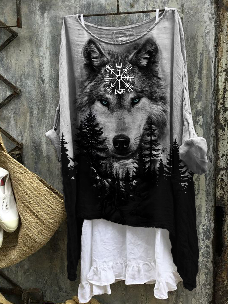 Vegvisir Wild Wolf Forest Contrast Linen Blend Tunic